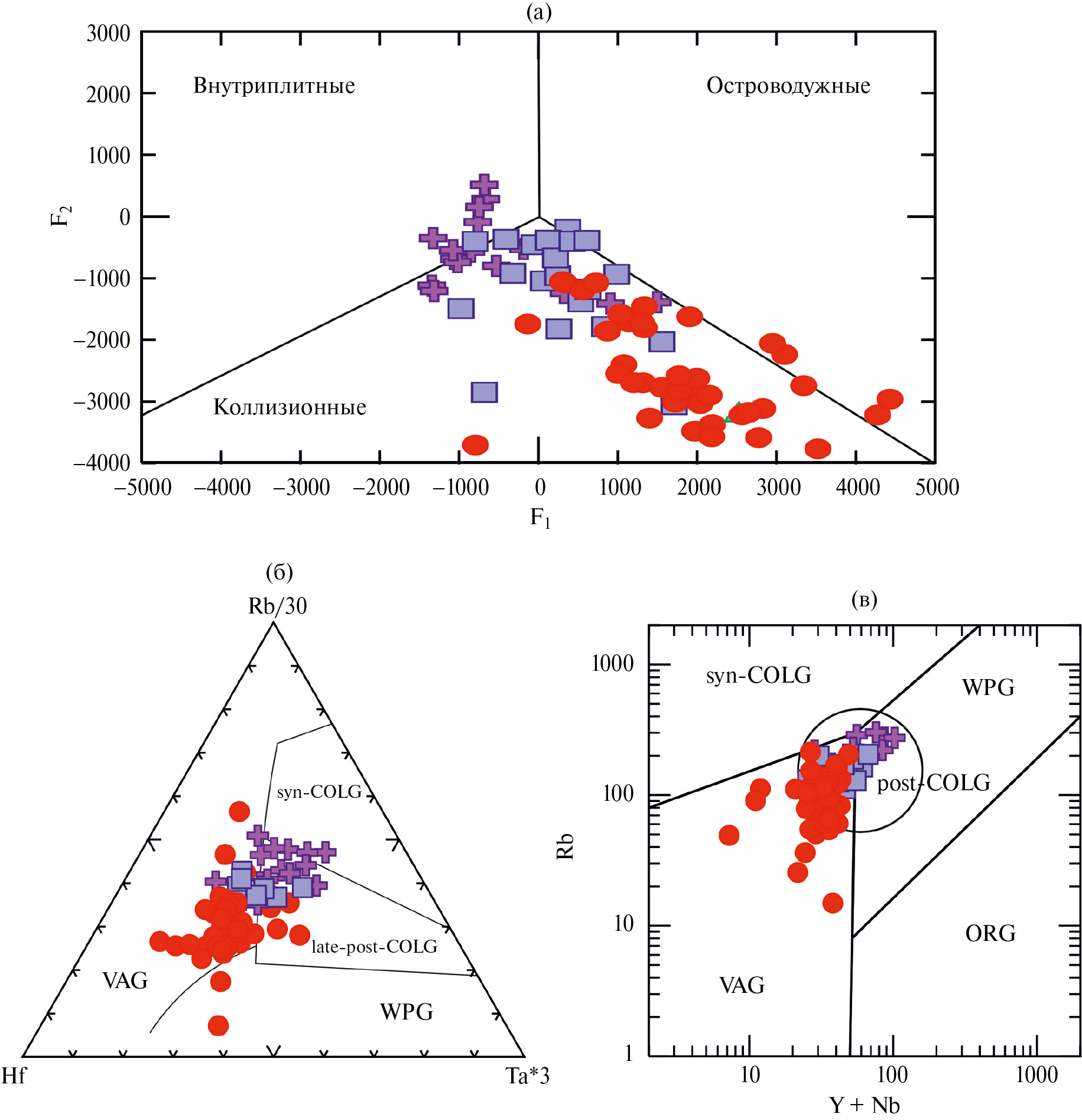 На диаграмме F1–F2 [2], разделяющей гранитоиды в связи с геодинамической обстановкой формирования точки составов гранитоидов всех комплексов расположены преимущественно в поле коллизионных гранитов (рис. 5а). На аналогичных диаграммах Hf–Rb/30–Ta*3 и Rb–Y+Nb точки составов гранитов и лейкогранитов омчикандинского и саханьинского комплексов приурочены к границе полей син- и постколлизионных гранитов, а гранитоиды арга-эмнекенского комплекса – к полям островодужных и постколлизионных (рис. 5 б, в).