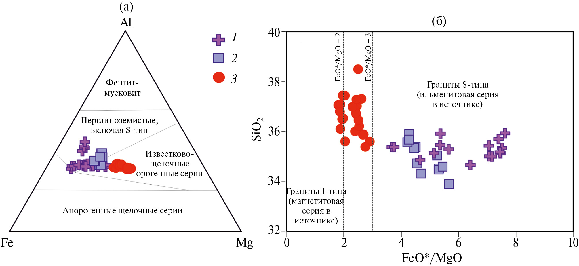 Рис. 6. Диаграммы Fe–Al–Mg ф.е.(а) [11] и SiO2–FeO*/MgO мас. % (б) [17] для биотитов из гранитоидов саханьинского, омчикандинского и арга-эмнекенского комплексов. Условные обозначения см. рис. 3.