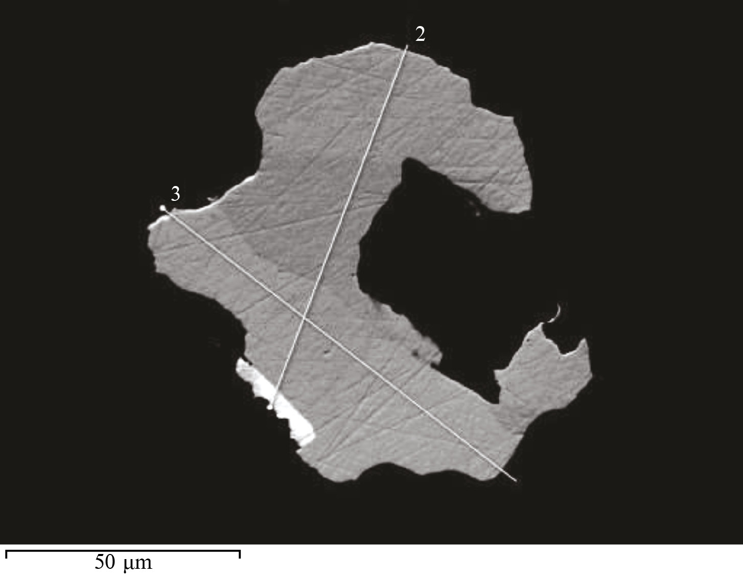 Сканирующая электронная микроскопия. Исследование химического состава производилось на сканирующем электронном микроскопе “JSM-5610LV” с энергодисперсионным спектрометром Oxford ULTIM MAX100 с аналитической программой Oxford AZtec 5.1 в лаборатории кристаллохимии минералов ИГЕМ РАН. Ускоряющее напряжении составило 25 кВ. Спектрометр был предварительно откалиброван на эталоне Co. Размер исследуемого зерна составил приблизительно 100×60 мкм.