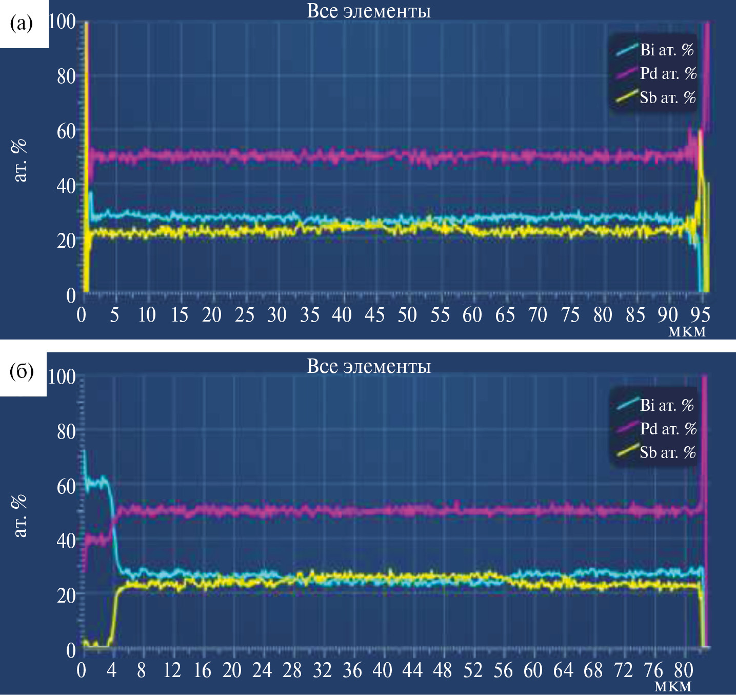 Сканирующая электронная микроскопия. Данные сканирующей электронной микроскопии представлены в табл. 2. Также были получены спектры распределения элементов вдоль линий профилей (рис. 2 а, б). При совмещении спектров элементов видно, что содержание палладия остаётся неизменным, а содержания сурьмы и висмута взаимосвязанно колеблются в пределах 4 мас. %. Рассчитанные эмпирические формулы для каждого профиля так же приведены в табл. 2 (расчёт проводился на 1 атом палладия). Усреднённая эмпирическая формула по всему зерну — Pd(Bi0.53, Sb0.47).
