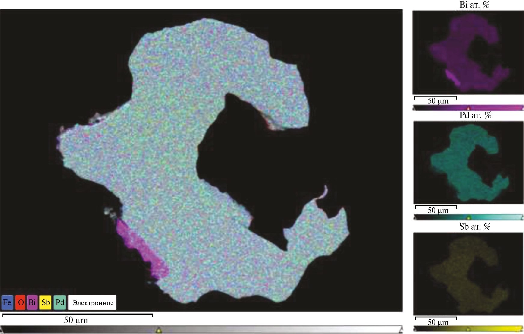 На карте распределения элементов (рис. 3) хорошо видно, что зерно имеет небольшой яркий на картине в режиме BSE участок с ярко выраженным преобладанием Bi (предположительно Pd2Bi3) и полным отсутствием Sb, который был отделён от зерна, и в дальнейшем исследовании не участвовал. Кроме того, в центре зерна проявляется зона с повышенным содержанием Sb относительно Bi, однако чёткой границы на картах распределения элементов не устанавливается, что позволяет считать зерно однородным.