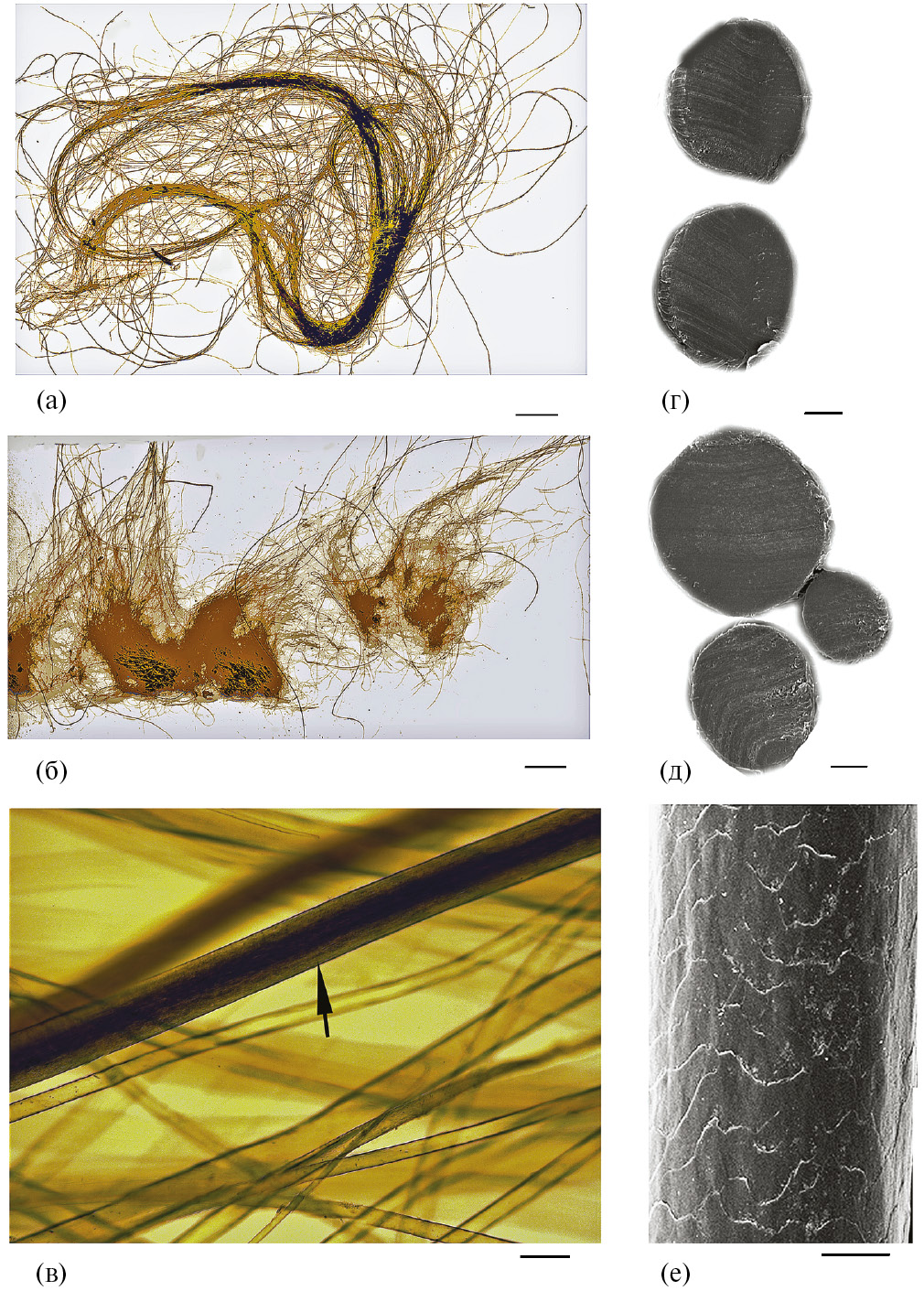 Особенности шерсти носорога. Шерсть Абыйского носорога имеет однообразную светло-бурую расцветку (рис. 2a, б) благодаря сочетанию белых, бежевых и коричневых волос разных оттенков, а также разной густоте волос. Верхний ярус (ворс) всегда темнее нижнего (подпушь) за счёт тёмно-коричневых, иногда почти чёрных крупных направляющих волос и остей бежевого цвета (рис. 2 а, в). Подпушь имеет более светлый оттенок, поскольку содержит многочисленные бежевые и белые пуховые волоски. Шерсть имеет более тёмную расцветку на ушах и стопах и более светлую на спине, брюхе и задних ногах. Морфометрия позволяет выделять направляющие волосы (толщиной 113–158 мкм), остевые и пуховые волосы трёх размерных порядков (56–79, 33–45 и 11–23 мкм соответственно; рис. 2 в). Самые толстые волосы покрывают нижнюю челюсть и голень, а самые тонкие растут на ушной раковине. Ости правильной цилиндрической формы (рис. 2 г, д), а пух слабо извитой (рис. 2 а, б). Из слоёв волоса развиты только два — тонкая черепичная кутикула и мощная плотная кора, в то время как сердцевина отсутствует. Кутикула имеет сходный орнамент у волос из разных участков тела. Её крупные чешуйки наполовину или целиком оборачивают стержень, имеют сильно изрезанный апикальный край и треугольные выросты (рис. 2 д), иногда ориентированы под углом 20–25° к поперечной оси стержня. Высота чешуек изменяется незначительно (26–29 мкм), но немного больше у волос бедра и брюха (31– 33 мкм). Сравнение с ранее изученными особями (носорог Саша, молодая и старая самки; [16–18]) показывает, что: (1) ювенильные носороги имели однообразную, светлую (вплоть до блонд) и относительно тонкую шерсть без тёмного и грубого ворса; (2) в 4–4.5 года носороги приобретали более тёмный окрас, с длинной (особенно на пояснице) полиморфной ярусной шерстью, у них отрастал длинный, толстый и тёмный ворс; (3) взрослые были покрыты мощной и грубой, тёмно-коричневой шерстью с чёрным ворсом и белыми, светло-бежевыми или красноватыми локальными пятнами, обладающей отменными теплозащитными и механическими свойствами, эффективно защищавшими этих зверей от внешних воздействий. Из основных микроструктур волос развиты кора и кутикула, но у взрослых особей сердцевина иногда все же присутствует в волосах и имеет ячеистое строение, что позволяет отличать волосы шерстистого носорога от волос шерстистого мамонта (Mammuthus primigenius Blumenbach, 1799), которые полностью лишены сердцевины.