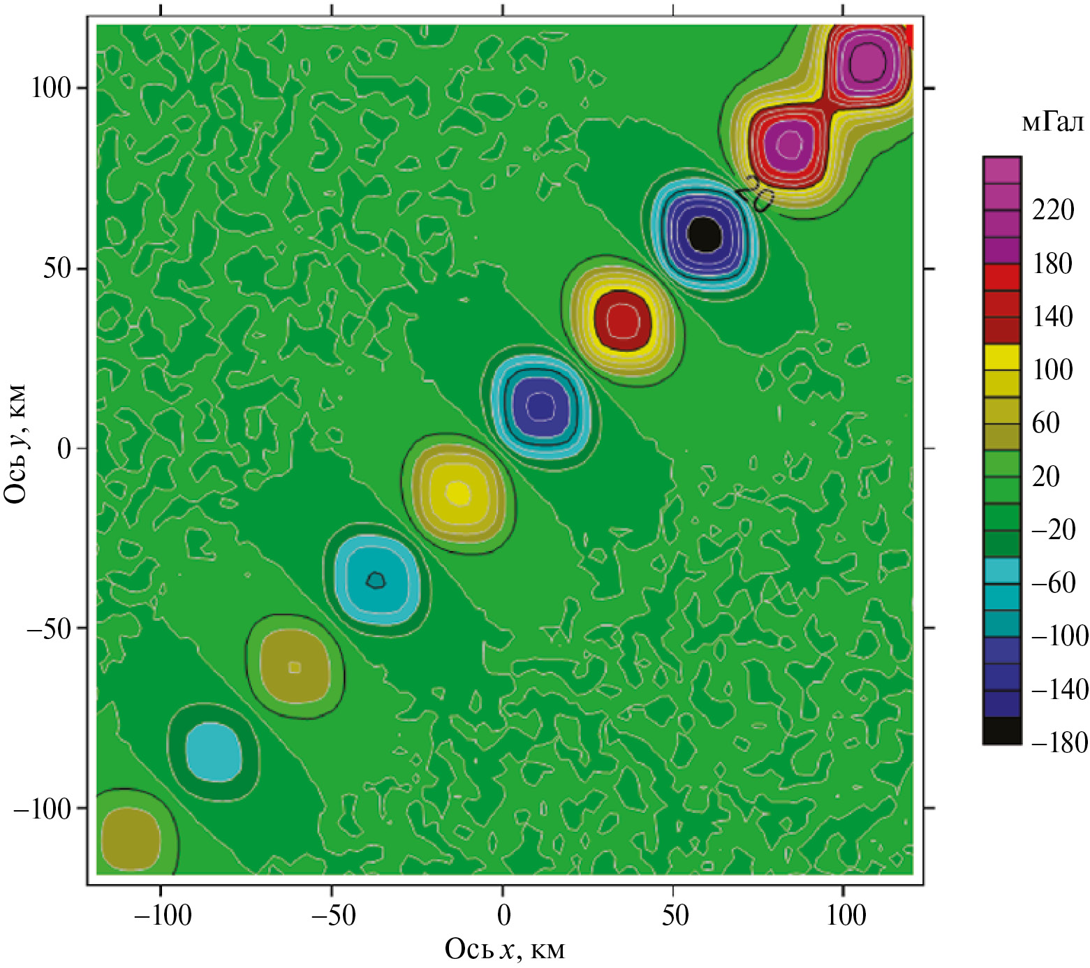 Предлагаемый в статье комбинированный подход к решению обратных линейных и нелинейных задач геофизики был апробирован на модельных и практических примерах. В модельном примере № 1 аномальное гравитационное поле создавалось набором из 10 прямых призм, нижние основания которых расположены на глубине 1 км под землёй, а высоты призм варьировались от 200 метров до 600 метров, а также 4 призм высотой 200 метров, нижние основания которых находились на глубине 3 км. Плотность породы в 6 верхних призмах полагалась равной 1.0 г/см3 и 0.5 г/см3 — в четырёх других; в нижних призмах плотность составила 1.0 г/см3. Участок съёмки имел размеры 100×100 км, рельеф местности выбирался спокойным, ровным (это означает, что перепад высот не превышал 250 метров). Пунктов наблюдения было 10 000 (т.е. вся выборка данных имела объем m = 10 000). Поперечники призм варьировались от 8 до 40 км. Поле призм аппроксимировалось суммой простого и двойного слоёв, распределённых на нескольких горизонтальных плоскостях (от 2 до 10), залегающих на глубинах от 100 метров до 500 м. Карта изолиний гравитационного поля призм приведена на рис. 1. Мы решили вариационную задачу (12) с помощью методики, описанной в [1] и нашли эквивалентные по внешнему гравитационному полю распределения масс на горизонтальных плоскостях для (b, v, r, k, λ)-конфигурации, в которой b = 10, k = 1 000, v = 20, r = 500, λ = 5. Поясним смысл параметров указанной конфигурации, которая соответствует примеру № 2 из первого раздела статьи.