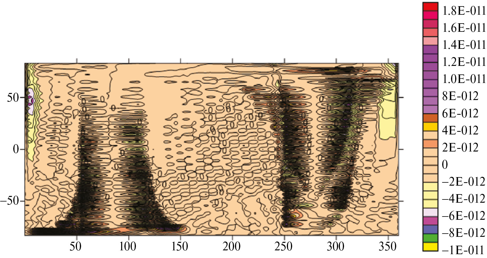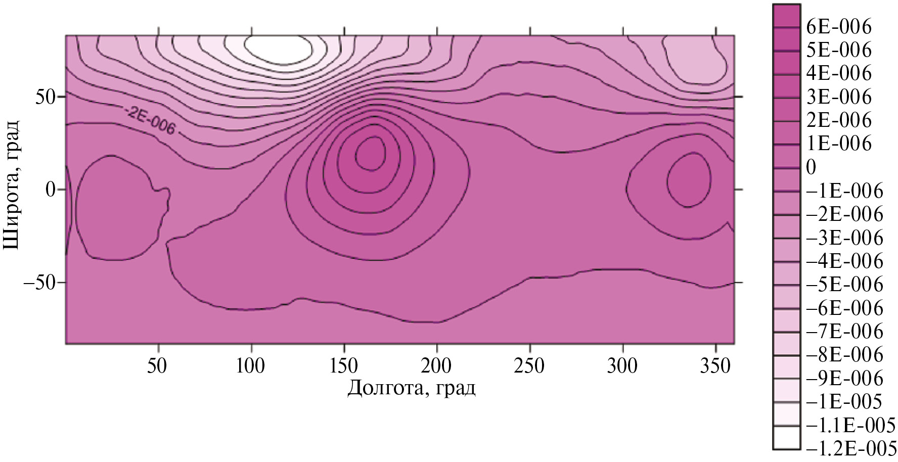 Рис. 4. Распределение эквивалентных по магнитному полю диполей на сфере R = 2400, построенное по всей выборке.