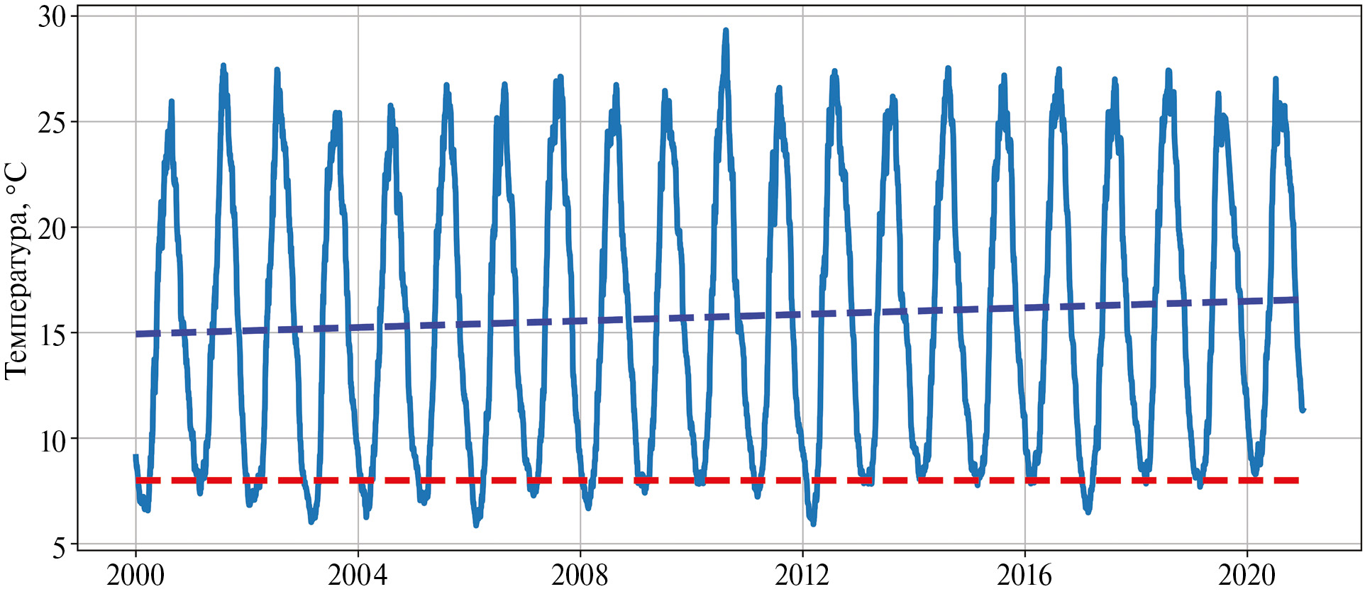 Рис. 2. Временной ряд спутниковых измерений ТПМ, осреднённой по площади Чёрного моря. Синей линией показана линия регрессии для временного ряда ТПМ. Красная линия соответствует температуре 8°С.