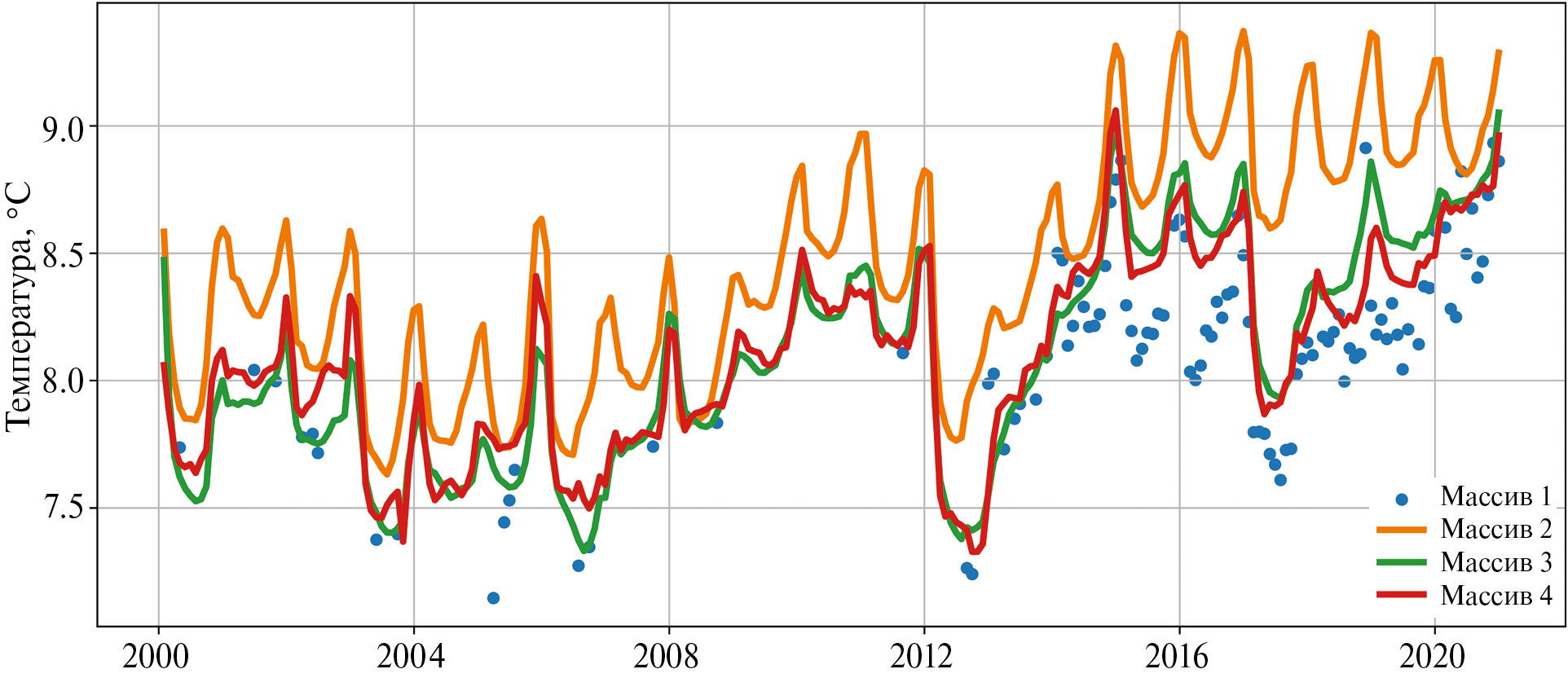 Тенденции изменений температуры морской воды на горизонте 60 м, вблизи минимума температуры ХПС, представлена на рис. 3. Видно, что массив 2 даёт несколько завышенные значения температуры морской воды и не воспроизводит зимнюю конвекцию 2017 года, что вызывает существенный прогрев в последующие годы, тогда как массивы 3 и 4 демонстрируют сходные её изменения в течение всего исследуемого периода времени. Тем не менее во всех трёх реанализах наблюдается синхронное развитие зимней конвекции близкой интенсивности вплоть до 2016 года. В те годы, когда ТПМ опускается ниже 8°С, температура на горизонте 60 м также принимает значения, характерные для ядра ХПС. Однако в силу относительно мягких зим 2009–2011 гг. температура воды на глубине 60 м превысила 8°С в течение всего года.