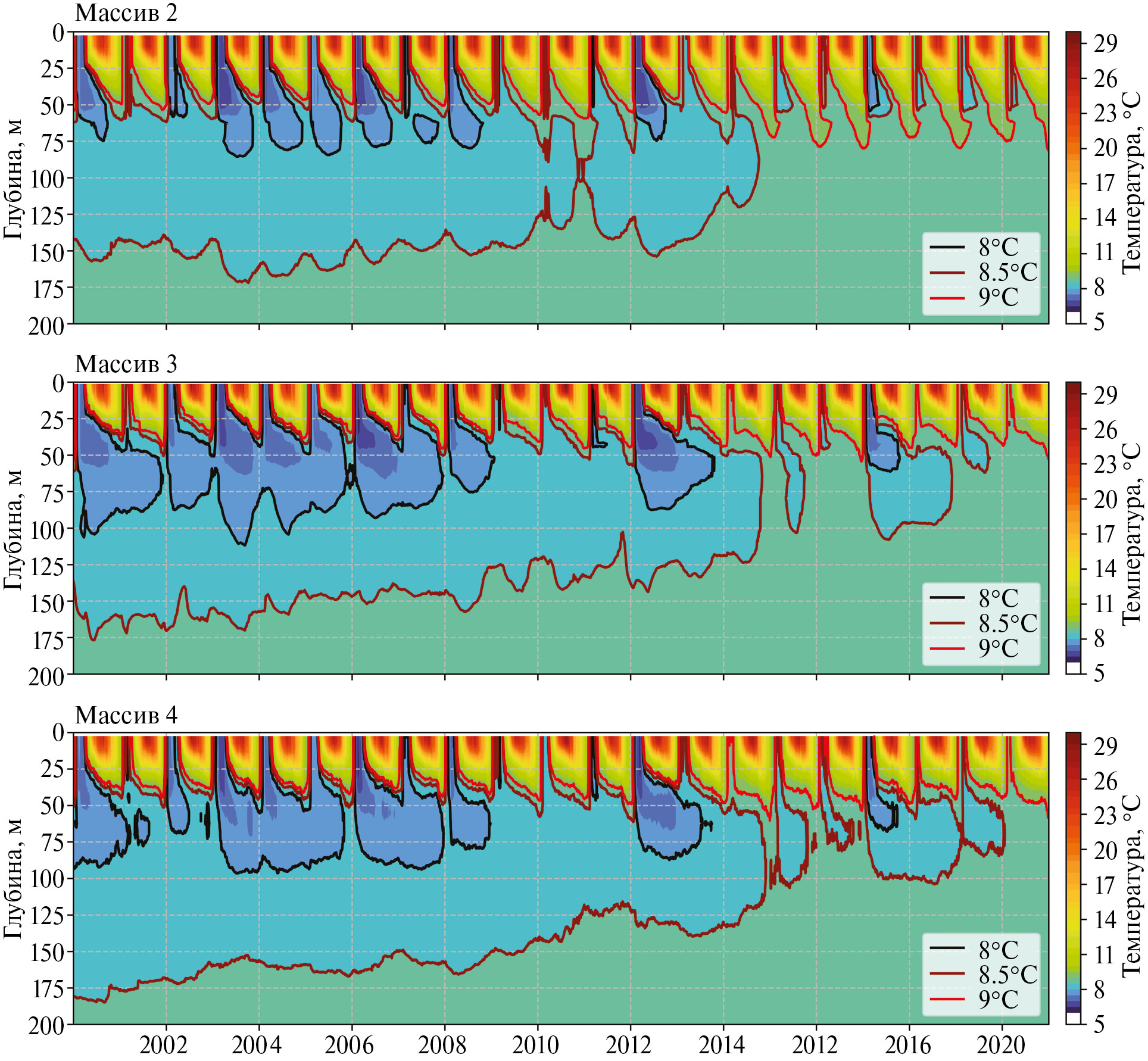 В 2009–2011 годы температура в его ядре ХПС повышается до 8.1–8.3°С. Холодная зима 2012 года восстановила ненадолго привычные для ХПС температуры. Однако затем, традиционный вентилируемый ХПС хоть и сохраняется, но температура в его ядре возрастает до 8.5–8.6°С. В 2017 году минимальная зимняя ТПМ была ниже 8°С и соответствовала примерно зиме 2004 года. На рис. 4 видно, что тем не менее сформировавшийся в 2017 году традиционный вентилируемый ХПС имеет значительно меньшую интенсивность в сравнении с 2004 годом. Тем не менее поступивший в 2017 году объём холодных вод ещё поддерживал ХПС с постепенно нарастающей температурой в ядре до 8.6–8.7°С в конце 2018 года. В 2019 году ТПМ была немного ниже 8°С, однако сформировавшийся в результате конвекции ХПС имел температуру воды в ядре уже 8.5°С, которая выросла до 8.6°С к концу года. Значение температуры морской воды в ядре ХПС в 8.6°С, достигнутое в 2019 году, является рекордным.