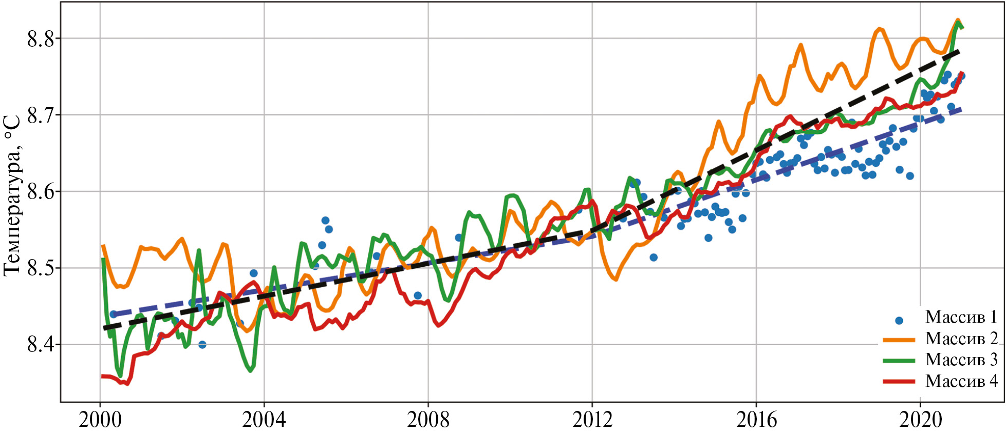 В поверхностном слое моря, до глубин порядка 10 м, все реанализы дают очень близкие изменения температуры моря, отражающие её сезонные и межгодичные изменения. Совпадение временного хода в этом слое в разных реанализах не удивительно, поскольку в каждом из них ассимилируются наблюдения ТПМ с ИСЗ. Поэтому на рис. 2 приведён временной ход осреднённой по площади ТПМ только по спутниковым наблюдениям. Приведённый график показывает явно выраженный сезонный ход ТПМ и межгодичную изменчивость максимальных и минимальных температур. Приведённая на рис. 2 линейная регрессия показывает тенденцию повышения средней ТПМ за весь рассматриваемый период. Положительный тренд температуры в поверхностном слое, рассчитанный по среднегодовым значениям, составил 0.4°С за 10 лет, что превышает типичные для Мирового океана значения и сопоставим с высокими темпами потепления в полярных широтах. Отметим особо значительное сокращение событий с минимальным значением ТПМ ниже 8°С после 2008 и особенно после 2012 года.