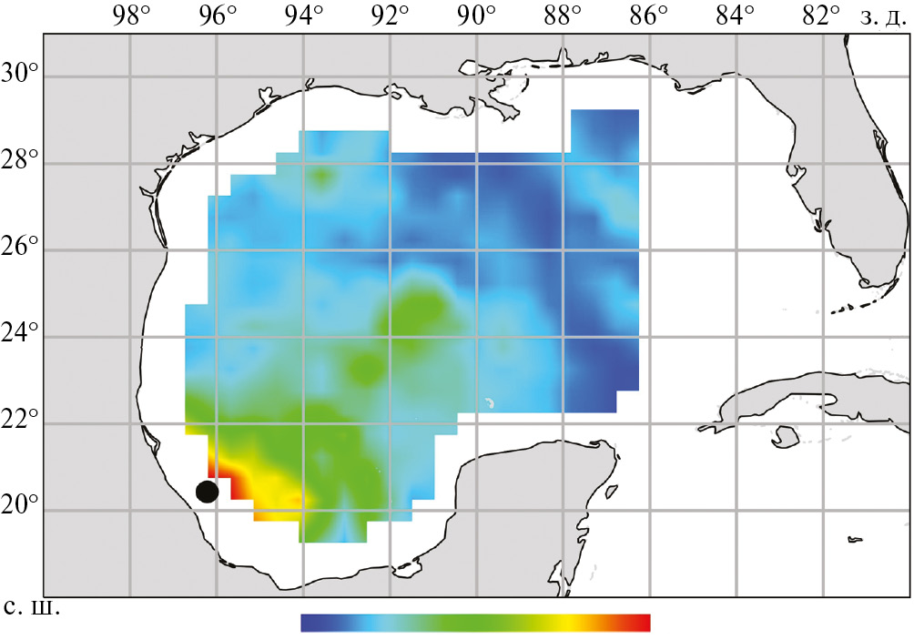Рис. 2. Пространственное распределение потоков скрытого тепла в Мексиканском заливе 20 августа 1999 г., 12 часов дня. Точка – район зарождения ТУ Bret.