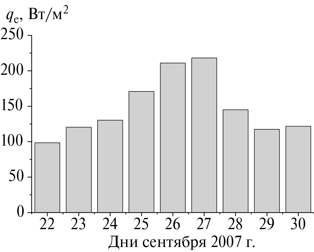 Рис. 3. Динамика нарастания суточных потоков скрытого тепла в районе зарождения ТУ Lorenzo — квадрате 1 о×1о с координатами центра 20.5 о с. ш., 96.3 о з. д. Начало стадии тропического урагана 27 сентября.