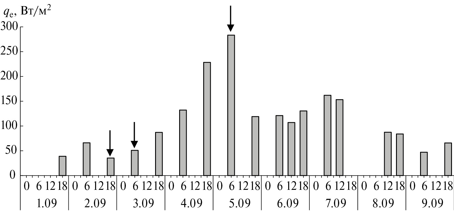 Рис. 5. Вариации поверхностных потоков скрытого тепла qe в районе зарождения ТУ Ivan в период 1–9 сентября 2004 г. Стрелочками отмечены даты и время начала стадий тропической депрессии (2.09), тропического шторма (3.09) и тропического урагана (5.09). Пропуски отдельных 6-часовых выборок обусловлены отсутствием соответствующих данных в архиве HOAPS.