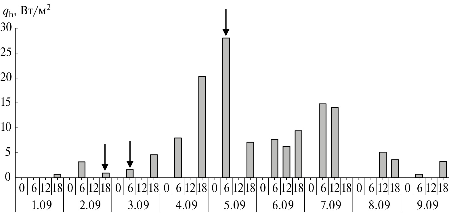 Рис. 6. Вариации поверхностных потоков явного тепла qh в районе зарождения ТУ Ivan в период 1–9 сентября 2004 г. Стрелочками отмечены даты и время начала стадий тропической депрессии (2.09), тропического шторма (3.09) и тропического урагана (5.09). Пропуски отдельных 6-часовых выборок обусловлены отсутствием соответствующих данных в архиве HOAPS.