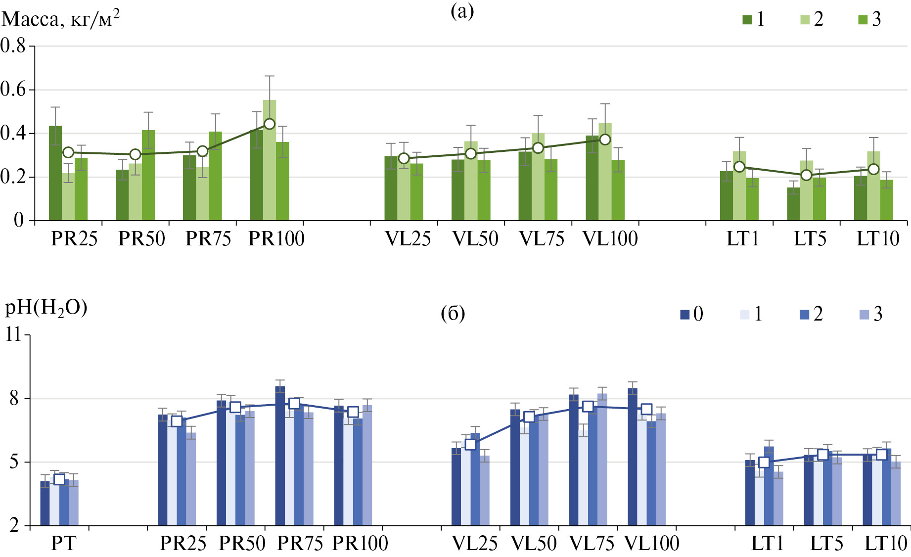 Внесение серпентинов увеличивает рН почвосмесей по сравнению с исходной РТ (рис. 2 б). Можно отметить тенденцию снижения показателя после первой зимы, тогда как в дальнейшем рН либо не изменялся, либо увеличивался по сравнению с предыдущим годом. При содержании серпентиновых материалов в интервале 25–75 об. % в первый год эксперимента значения рН были тем выше, чем выше доля минерального материала; такая же закономерность наблюдалась и для усреднённых по годам данных. Варианты PR75 и PR100 (как и VL75 и VL100) не отличались по актуальной кислотности. В вариантах PR75 и VL75 массовая доля РТ составляла всего 5–10 мас. %, что позволило мелиорантам полностью нейтрализовать кислотность торфа. Между биомассой и значением рН почвосмесей наблюдалась линейная корреляция (рис. 3 а).