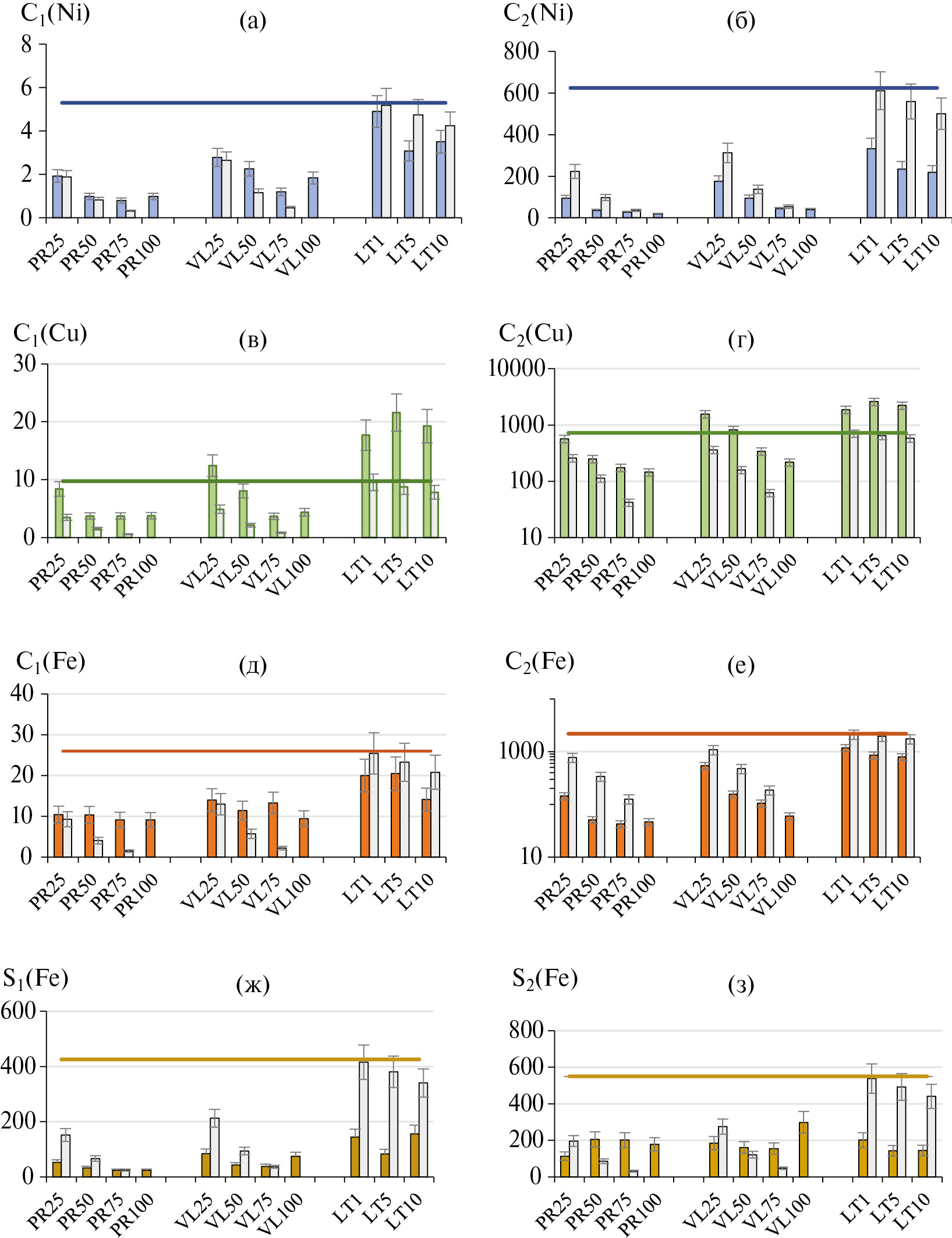 Рис. 5. Содержание компонентов в водорастворимой (С1, мг/кг) и доступной для растений (С2, мг/кг) форме, цветные столбики — усреднённые по годам экспериментальные значения, серые столбики — расчётные значения, линией показаны данные для исходного торфа.