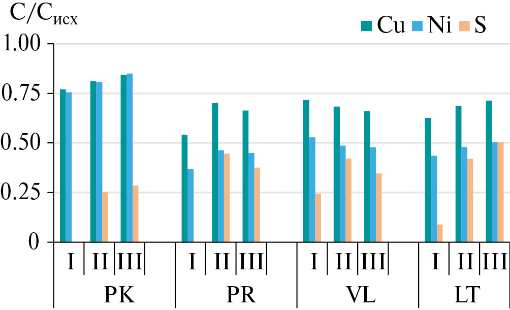 Проанализировано валовое содержание компонентов в пересчёте на прокалённый остаток. Статистический анализ показал, что относительная ошибка определения компонентов составляла для Cu 20–25%, для Ni 10–15% и для S 10–20%. По результатам эксперимента установлено достоверное (p <0.05) снижение содержания в почвосмесях указанных выше компонентов (рис. 7), причём доля выщелоченной из модулей фракции в вариантах с серпентинсодержащими материалами была меньше по сравнению с контрольным вариантом. В контрольном варианте доля выщелоченной фракции Cu и Ni изменялась в пределах 75–85%, что согласуется с данными работы [12] о содержании фракции, извлекаемой из РТ путём трёхкратной обработки ацетатно-аммонийным буфером.