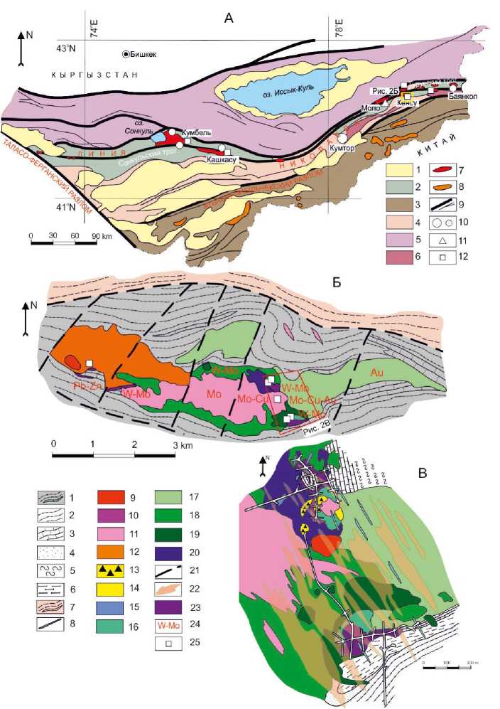 Рис. 2. Геологические схемы (А) Восточного Кыргызстана, показывающая позицию “линии В.А. Николаева” и строение прилегающих территорий, (Б) строение Кенсуйского плутона, и (В) строение части Кенсуйского плутона. А: 1 – кайнозойские отложения, 2 – позднедевонские-раннекаменноугольные сутурные троги (Сонкульский, Турукский), 3 – террейны Южного Тянь-Шаня, 4 – террейны Срединного Тянь-Шаня, 5 – террейны Северного Тянь-Шаня, 6 – палеопротерозойские (до архейских?) гнейсы, амфиболиты, мигматиты (блоки основания Таримского кратона, отчленённые по системам рифтов), 7 – позднекаменноугольные-раннепермские интрузивы шошонитовой и высококалиевой известково-щелочной серий, 8 – отдельные позднекаменноугольные-пермские гранитоидные интрузивы Южного Тянь-Шаня, 9 – разломы, 10–12 – месторождения и рудопроявления (10 – золота, 11 – вольфрама, 12 – молибдена). Б–В: 1–6 нижнекаменноугольные отложения Турукского прогиба (1 – нерасчлененные, 2 – чередование сланцев и песчаников, 3 – доломитовые и кальцитовые мраморы, 4 – кварциты, 5 – кварц-полевошпат-биотитовые роговики, 6 – тонкое чередование скарнов, мраморов, роговиков и кварцитов), 7 – верхненеопротерозойские-кембрийские сланцы, песчаники, основные вулканиты, доломиты, песчаники, 8–20 – позднепалеозойские породы Кенсуйского плутона (8 – поздние дайки основных пород, 9 – лейкограниты-аляскиты, 10 – монцограниты, 11 – кварцевые монцониты, 12 – кварцевые сиениты, 13 – магматические брекчии с сиенитовым цементом, 14 – сиениты, 15 – камптониты, 16 монцониты, 17 гибридные монцодиориты, 18 – монцодиориты, 19 “эссекситы”, 20 – “шонкиниты”), 21 – разломы, 22 – зоны карбонат-филлизитовых гидротермальных изменений, 23 – скарны, 24 – рудопроявления и зоны минерализации, 25 – места отбора проб пород на изотопные U–Pb-исследования цирконов