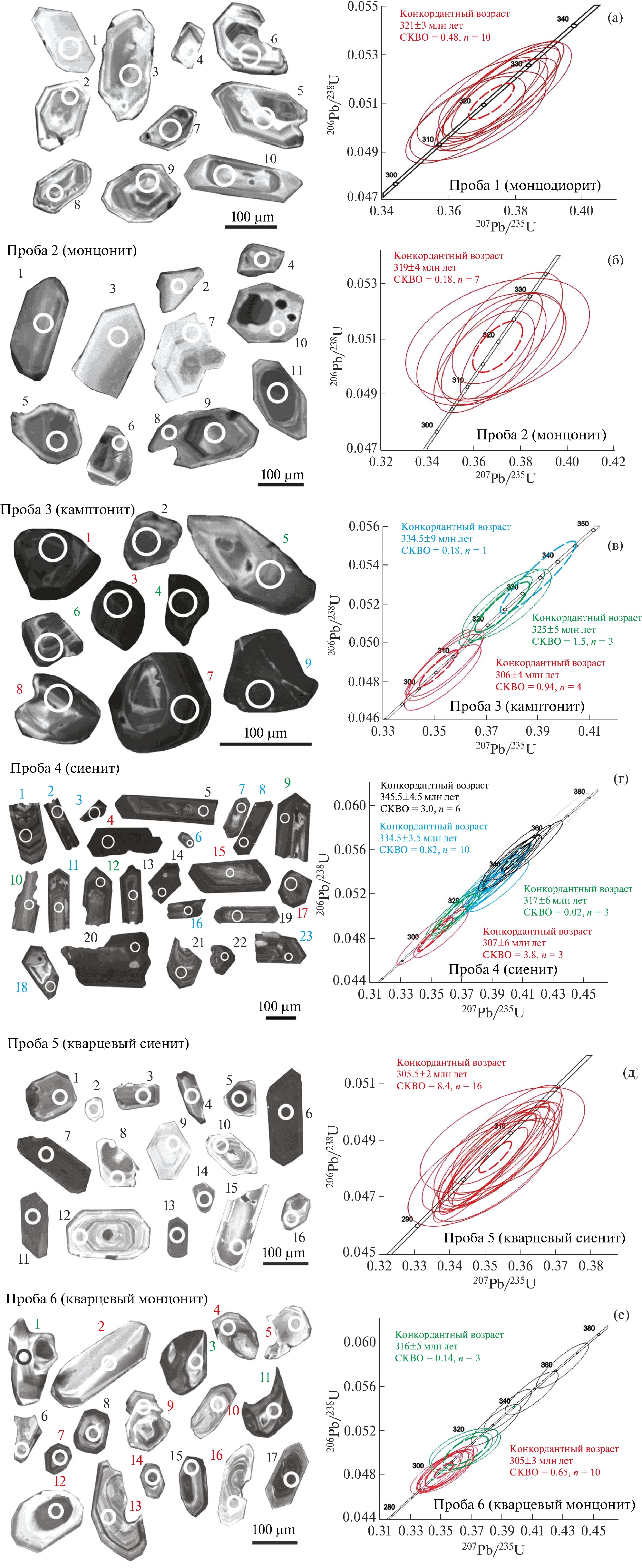 Рис. 3. Катодолюминесцентные изображения кристаллов циркона (окружностями обозначены точки, где проводилось изотопное датирование, номера точек соответствуют таковым в таблице 2) и диаграммы с конкордией для цирконов из интрузивных пород Кенсуйского плутона (тонкие сплошные эллипсы результаты единичных анализов, пунктирный эллипс соответствует конкордантному значению; погрешности единичных анализов и вычисленных конкордантных возрастов приведены на уровне 2σ)