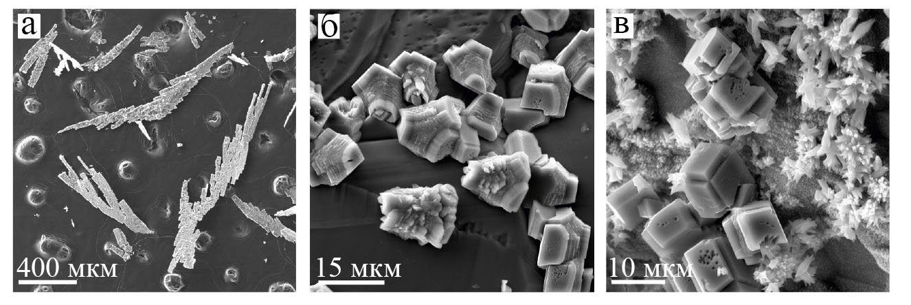 На рис. 2 представлены типичные кристаллы новообразованного арагонита, форма которых определяется развитием граней ромбической призмы, бипирамиды и пинакоида. В ряде экспериментов такие кристаллы, часто прозрачные, достигали размера от 100 до 400 мкм. При закалке в объеме и на стенках ампул выпадал арагонит в форме крупных пластинчатых дендритов (рис. 3 а). Кроме того, на поверхности кристаллов новообразованного и недорастворенного исходного арагонита появлялся закалочный арагонит в форме клиновидных розеток (рис. 3 б) или кальцит в виде изометричных микрокристаллов (рис. 3 в). Кальцит, очевидно, появлялся из водного раствора после вскрытия ампул и испарения из них воды в результате нагрева. Размер индивидов частично растворенного исходного и новообразованного арагонита позволял легко извлекать их из продуктов закалки водного флюида и, затем, взвешивать.