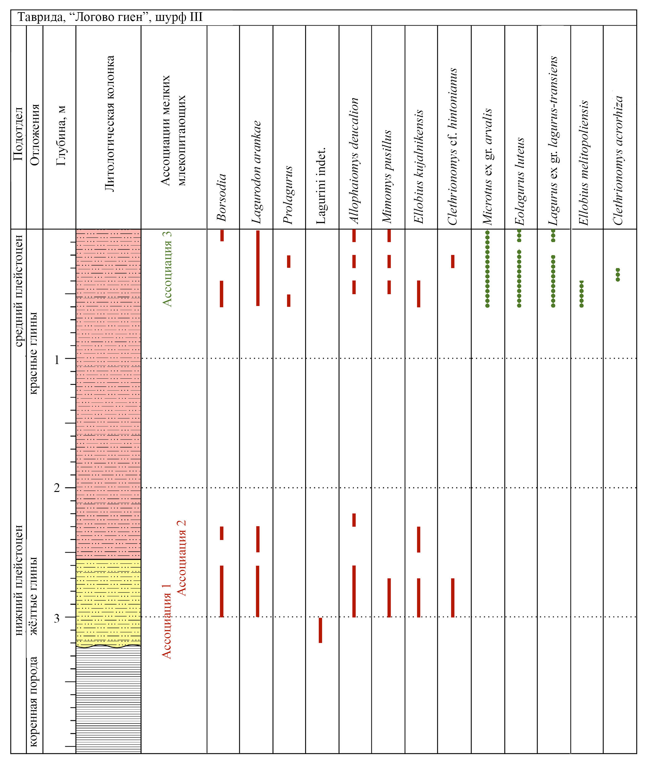 Для понимания стратификации плейстоценовых находок микротериофауны в пещере Таврида очень важными стали послойные сборы в боковом ходе точки “Логово гиен” ([1], рис. 1; [12], рис. 2). Здесь в глубоком понижении пола пещеры удалось отобрать пробы в непрерывном разрезе мощностью около 3 м (шурф III по [12]) (рис. 1). Несмотря на признаки перемешивания ископаемых материалов и в этой точке сборов (из-за биотурбации и частичного смешения проб в процессе отбора), удалось выявить отличия ориктокомплекса из самых нижних уровней раскопа (здесь обозначен как “ассоциация 1”, в отличие от “ассоциации 2” основного костеносного уровня). Материал отсюда имеет красновато-желтую окраску и включает остатки гипсодонтной корнезубой полевки рода Borsodia; некорнезубые пеструшки Lagurodon arankae (Kretzoi, 1954), которые являются доминантом в большинстве проб из нижнего плейстоцена в Тавриде, в пробах из этого уровня представлены единично или отсутствуют.
