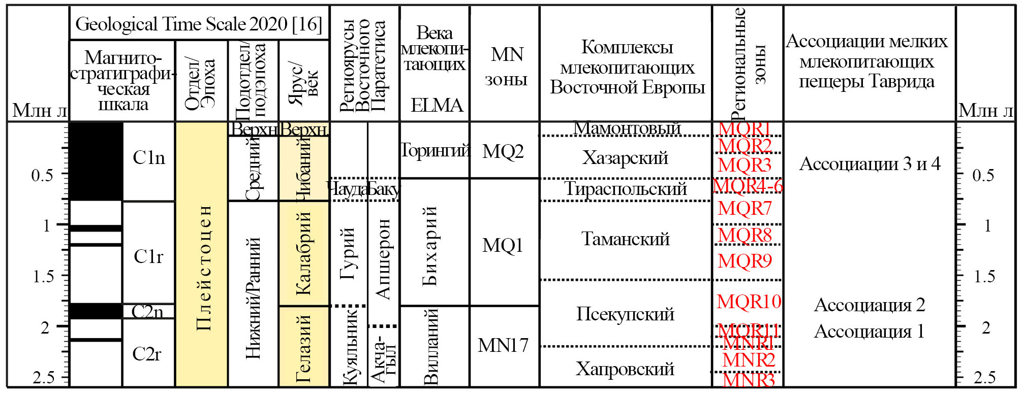 Доминирование в раннеплейстоценовой микротериофауне из основного костеносного уровня пещеры Таврида (центральный Крым) полевок Lagurodon arankae (Kretzoi, 1954) и Allophaiomys deucalion Kretzoi, 1969 позволяет датировать эту фаунистическую ассоциацию началом калабрия (около 1.8–1.6 млн л.н.) и соотносить с поздним виллафранком и зоной MQ1 европейской биохронологической схемы, второй половиной времени существования псекупского фаунистического комплекса и региональной биохронологической зоной MQR10 (зоной Allophaiomys deucalion – Prolagurus ternopolitanus). В нижней части отложений пещеры установлено присутствие элементов более древней региозоны MQR11 (Allophaiomys deucalion – Borsodia), которая датируется концом гелазия. Таким образом, раннеплейстоценовый этап формирования местонахождения Таврида отвечает временному интервалу около 2.1–1.6 млн л.н. В отложениях пещеры также обнаружены остатки мелких млекопитающих среднего плейстоцена с доминированием полевки Microtus ex gr. arvalis (Pallas, 1778). Эволюционный уровень этих ассоциаций позволяет датировать их серединой среднего плейстоцена (около 0.5–0.3 млн л.н.) и сопоставлять с региозоной MQR3 (зоной Arvicola mosbachensis – Lagurus transiens).