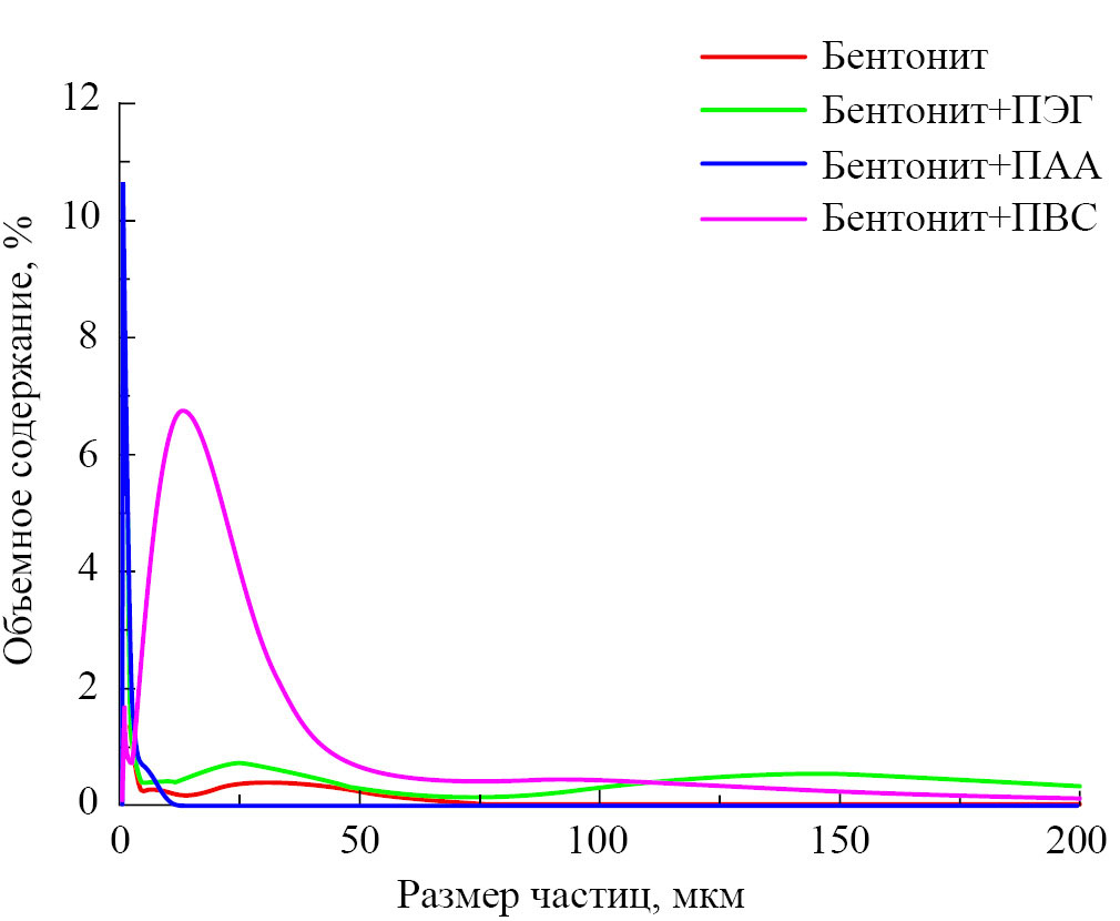 Наибольший размер образований в растворах бентонита с полимерами отмечен для поливинилового спирта. При этом сходное с контролем распределение частиц по размеру в вариантах опыта с ПЭГ и ПАА говорит о том, что вклад гидрофильных связей при сцеплении частиц бентонита и полимеров меньше, чем гидрофобных.
