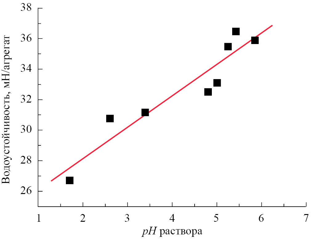Повышение рН подобным способом позволило получить коллоидные растворы с концентрацией 6.0 г/л по железу при рН 6.0 (рис. 3, 4). При этом увеличение рН сопровождалось повышением водоустойчивости чернозема с 26.7 до 38.6 мН/агрегат (рис. 3, табл. 2). По отношению к необработанному чернозёму водоустойчивость возросла на 59%, что заметно больше, чем при использовании полимерных структоров (табл. 1).