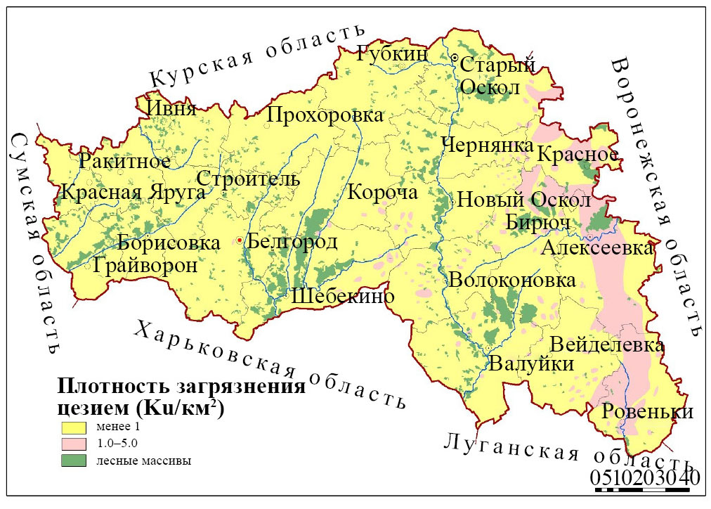 Research was conducted in 2023–2024 on the defining areas of the Belgorod region. Our research technique is conventional within the agrochemical service. The goal of this project was to study the specific activity of 40natural and artificial radionuclides in soils and plants of certain agroecosystems. Studies have shown that specific activity does not vary significantly between leached arable (539 Bq/kg), typical (544 Bq/kg) and ordinary (573 Bq/kg), while in residual carbonate chernozems the value of said measurement (207 Bq/kg) was 2.60–2.77 times lower. The average specific activity of 223Th in leached, typical and ordinary chernozems was 1.97–2.35 times higher than the other residual carbonat chernozems. The average specific activity of Ra in studied soils did not differ significantly, staying within 17.3–18.9 Bq/kg. In soils of the region’s western areas, specific activity of 173Cs ranged from 5,9 to 19,6, southern – 16.3–87.2 Bq/kg, while eastern sections of the region varied from 15.3–87.2 Bq/kg. Specific activity of 90Sr in western soils was below 3, whereas the south extended from 16.3 to 87.2 Bq/kg. An average of 40K specific activity altered from 111 Bq/kg to 597 Bq/kg was recorded within studied crop production, while 232Th’s and 226Ra’s ranges did not exceed 6 and 8 Bq/kg respectively. 136Cs’ specific activity was less than 3, while 90Sr stayed at less than 2 Bq/kg, which is significantly lower than the established limit for said parameter.