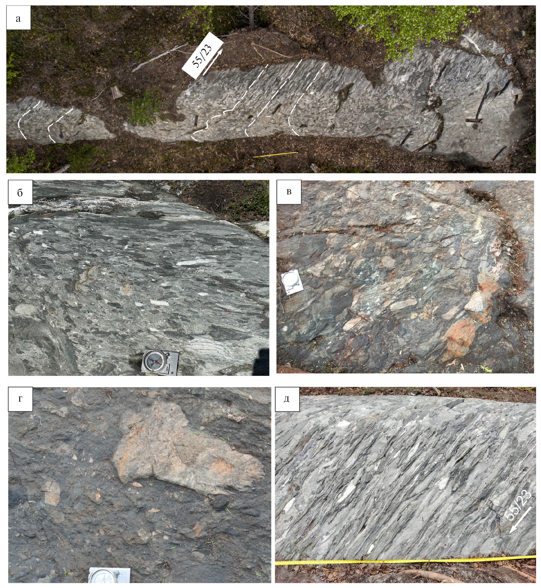 Рис. 2. Неоархейские (2.71 млрд лет) конгломераты Костомукшского зеленокаменного пояса в обнажении: (а) общий вид обнажения (масштаб – жёлтая рулетка 1 м), пунктир – структурные линии, стрелка – средняя ориентировка погружения линейности (СВ 55° под углом 23°); (б) конгломераты с эллипсовидными обломками метабазитов, полосчатых кварцитов – кварцевой граувакки, в породах видна полосчатость, плоскость фото субортогональна поверхности рассланцевания (масштаб – компас 10 см); (в) конгломераты с угловатыми и эллипсовидными обломками амфиболитов (матабазальтов), метабазальтов с плагиоклазовыми порфирами, кварцевой метаграувааки (масштаб – компас 10 см); (г) крупный обломок деформированной кварцевой метаграувааки (масштаб – компас 10 см); (д) конгломераты в плоскости, ортогональной поверхности рассланцевания и параллельной линейности, стрелка – ориентировка погружения линейности (СВ 55° под углом 23°)