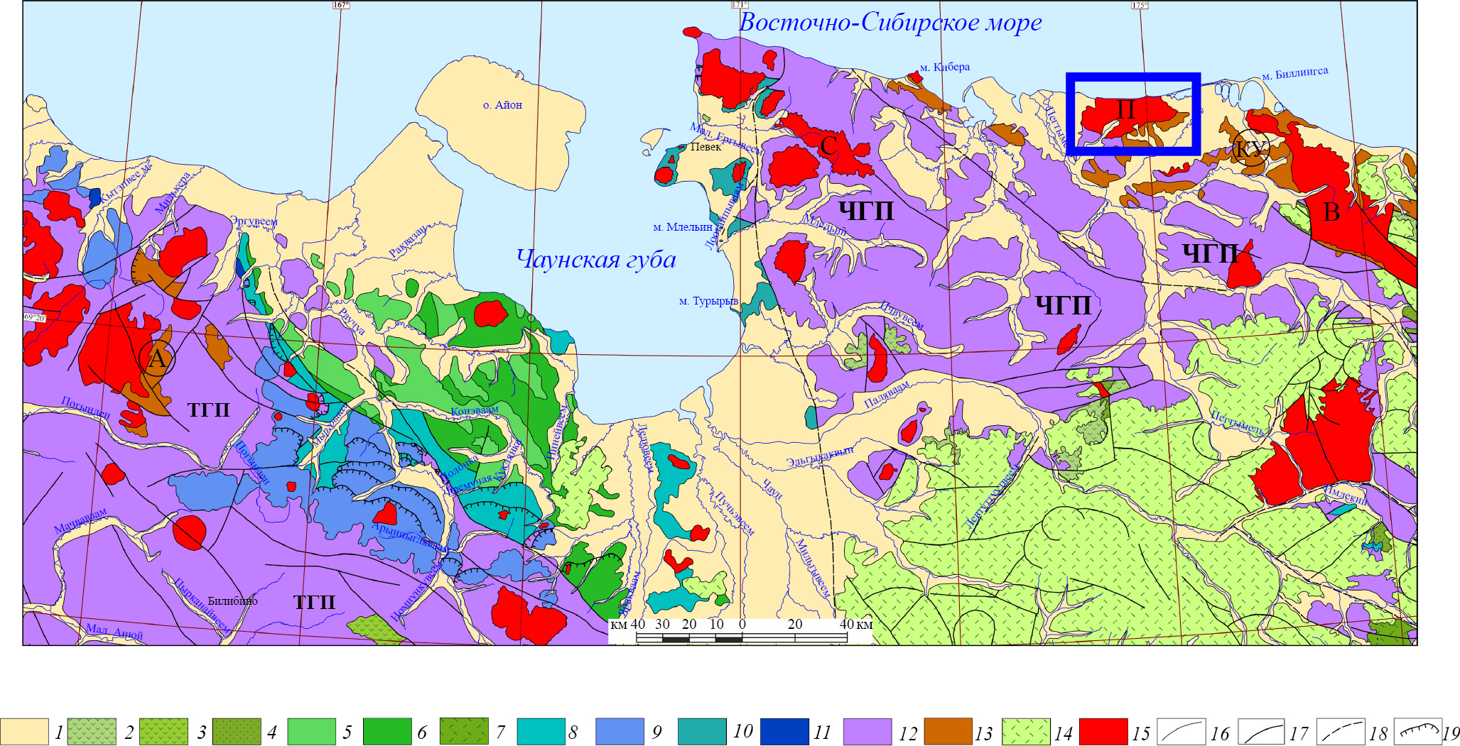 Рис. 1. Геологическая карта Анюйско-Чукотской складчатой системы (по [9] с изменениями). 1 – кайнозойский осадочный чехол; 2 – этчикуньский альбский вулканический комплекс; 3 – Тытельвеемский аптский вулканический комплекс; 4 – апт-альбские континентальные угленосные отложения; 5 – валанжинские терригенные отложения; 6 – берриасские терригенные отложения; 7 – берриасские вулканогенные отложения; 8 – волжские вулканогенно-терригенные отложения; 9 – оксфорд-кимериджские терригенные отложения; 10 – нерасчленённые верхнеюрско-нижнемеловые отложения; 11 – нижнеюрские терригенные отложения; 12 – триасовые терригенные отложения; 13 – палеозойские терригенно-карбонатные отложения; 14 – Охотско-Чукотский вулканический пояс; 15 – меловой интрузивный комплекс; 16 – геологические границы; 17–19 – тектонические нарушения: 17 – установленные, 18 – скрытые, 19 – надвиги. Буквы в кружках – тектонические поднятия: КУ – Куульское, А – Алярмаутское. ЧГП – альбская Чаунская гранитоидная провинция; ТГП – аптская Тытельвеемская гранитоидная провинция [1]. Массивы: П – Пыркатагинский, В – Велиткенайский, С – Северный. Синий прямоугольник – район работ