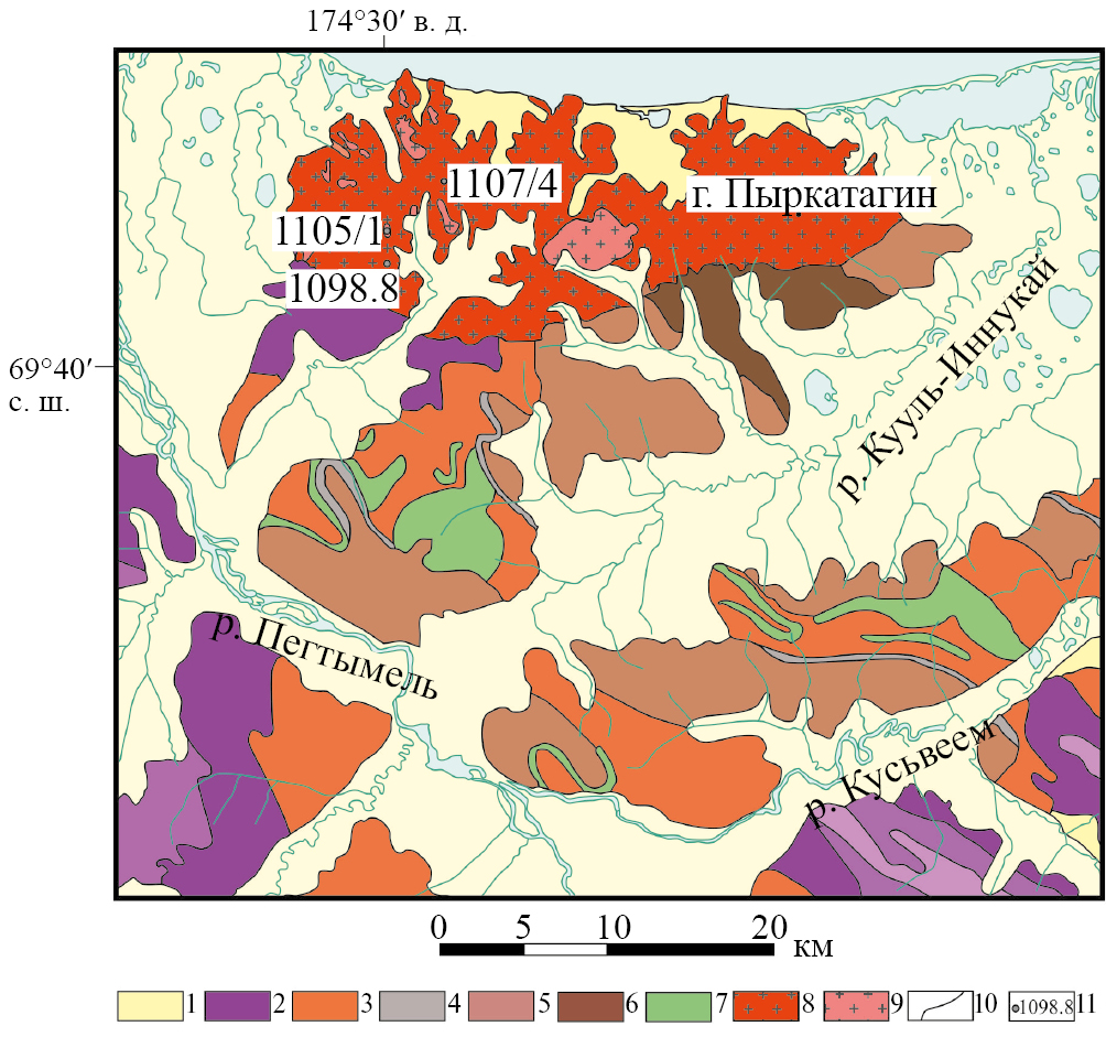 Рис. 2. Геологическая карта Пыркатагинского массива и его обрамления (по [10]). 1 – четвертичные отложения; 2 – нижне-среднетриасовые песчаники, алевролиты, глинистые сланцы, линзовидные прослои гравелитов и конгломератов; 3 – пермско-триасовые углисто-глинистые сланцы, алевролиты и известковистые песчаники; 4 – каменноугольные известняки, конгломераты, гравелиты, песчаники; 5 – верхнедевонские песчаники известковистые, глинисто-известковистые и кремнисто-серицитовые сланцы, алевролиты, известняки; 6 – нижне-среднедевонские песчаники кварцевые и известковистые, алевролиты, сланцы глинистые и углисто-глинистые, линзы известняков; 7 – анюйский габбро-долеритовый гипабиссальный комплекс: силлы и изометричные тела габброидов; 8 – порфировидные гранодиориты и граниты ранней фазы; 9 – лейкократовые мелкозернистые граниты поздней фазы; 10 – геологические границы; 11 – места отбора и номера геохронологических проб