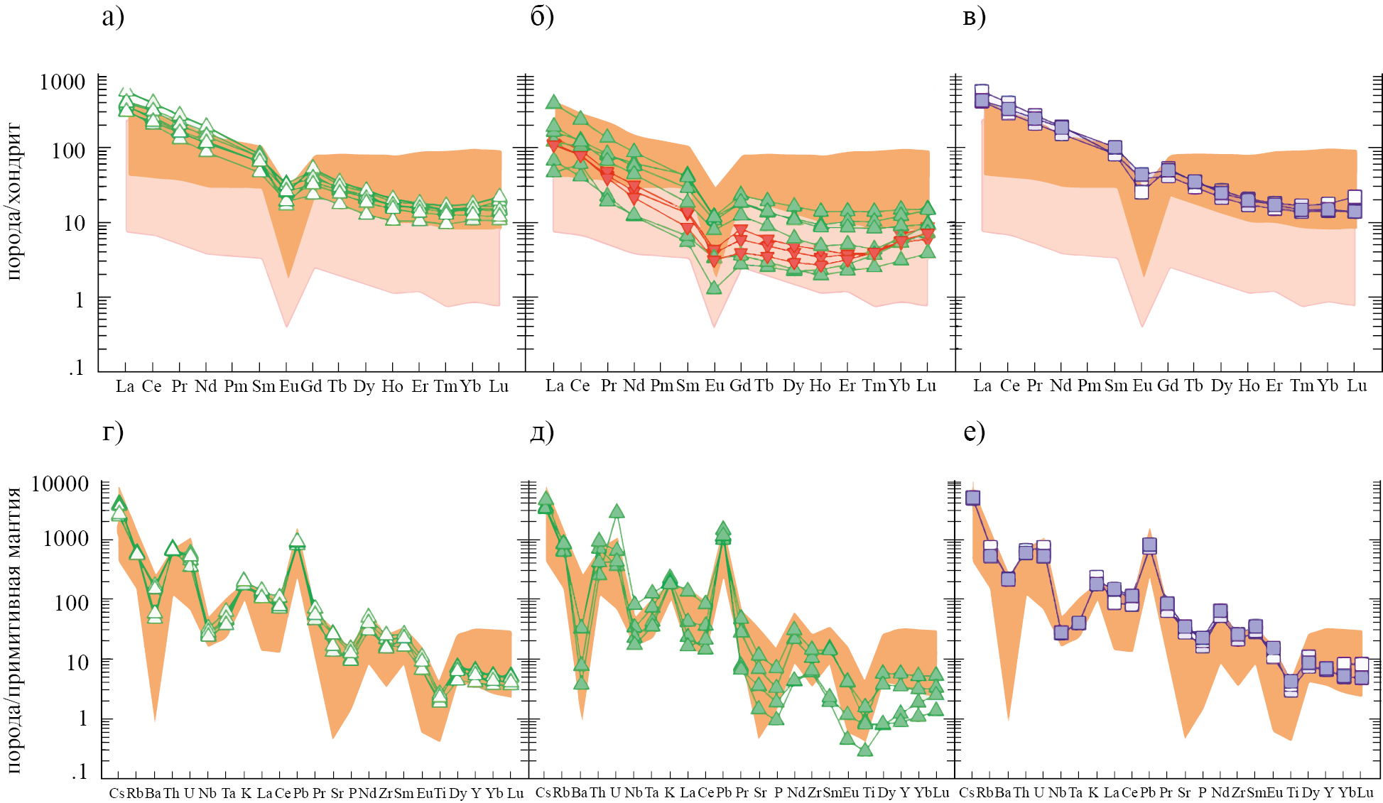 Для граносиенитов, умеренно-щелочных гранитов ранней фазы, монцонитов из включений и даек на спайдер-диаграммах характерны минимумы по Ba, Ta, Nb, Sr, P, Ti и максимумы Cs, Th, Pb, ЛРЗЭ (рис. 7 г, д). Спайдер-диаграммы гранитоидов поздней фазы и гранит-аплитов из даек отличаются более глубокими минимумами Ba, Sr, P, Ti (рис. 7 е).