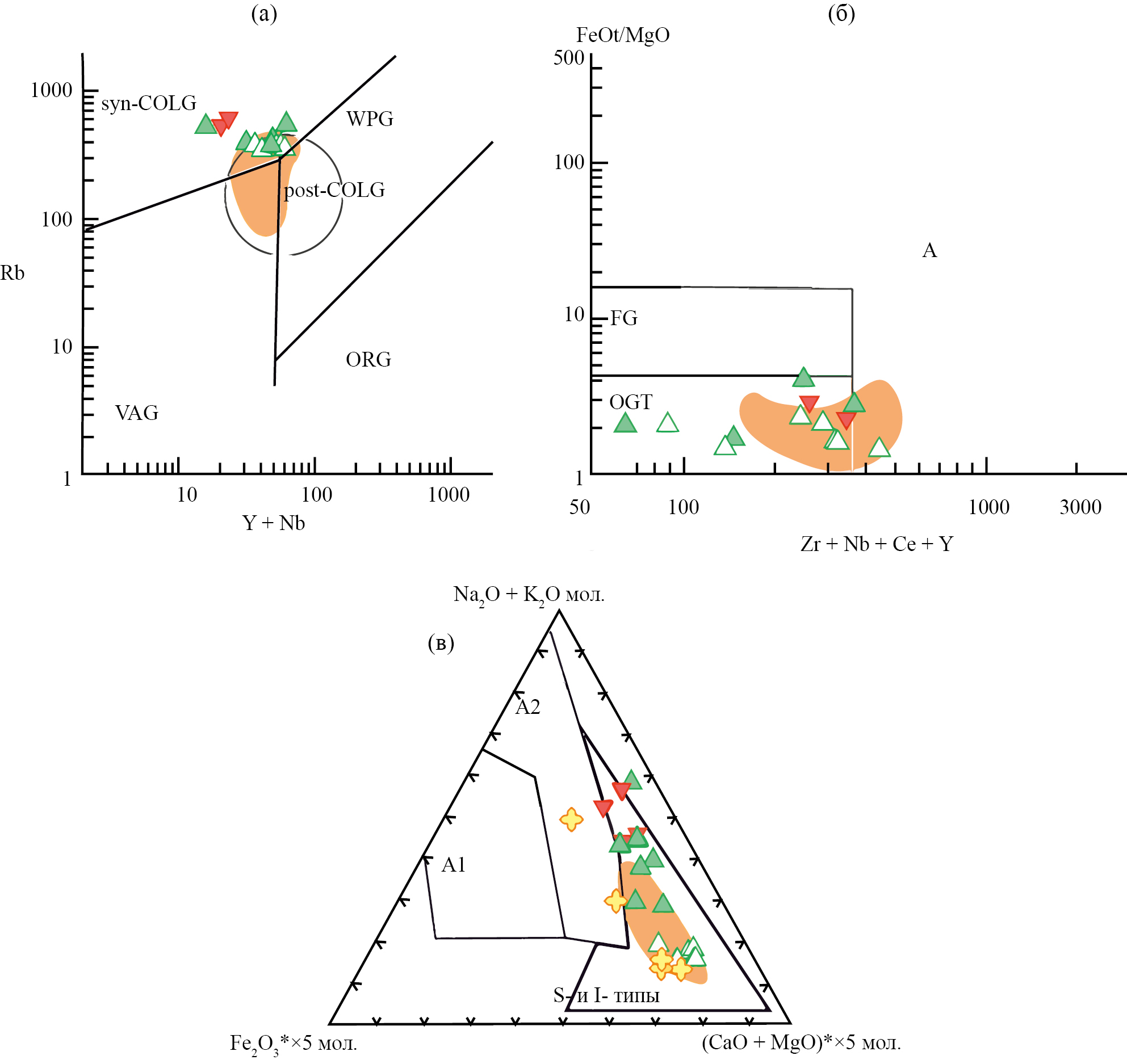 Рис. 9. Диаграммы Rb – Y + Nb (a), FeOt/MgO – Zr + Nb + Ce + Y (в), Fe2O3*×5 – Na2O + K2O – (CaO + MgO) × 5 (мол. кол.) для гранитоидов Пыркатагинского массива