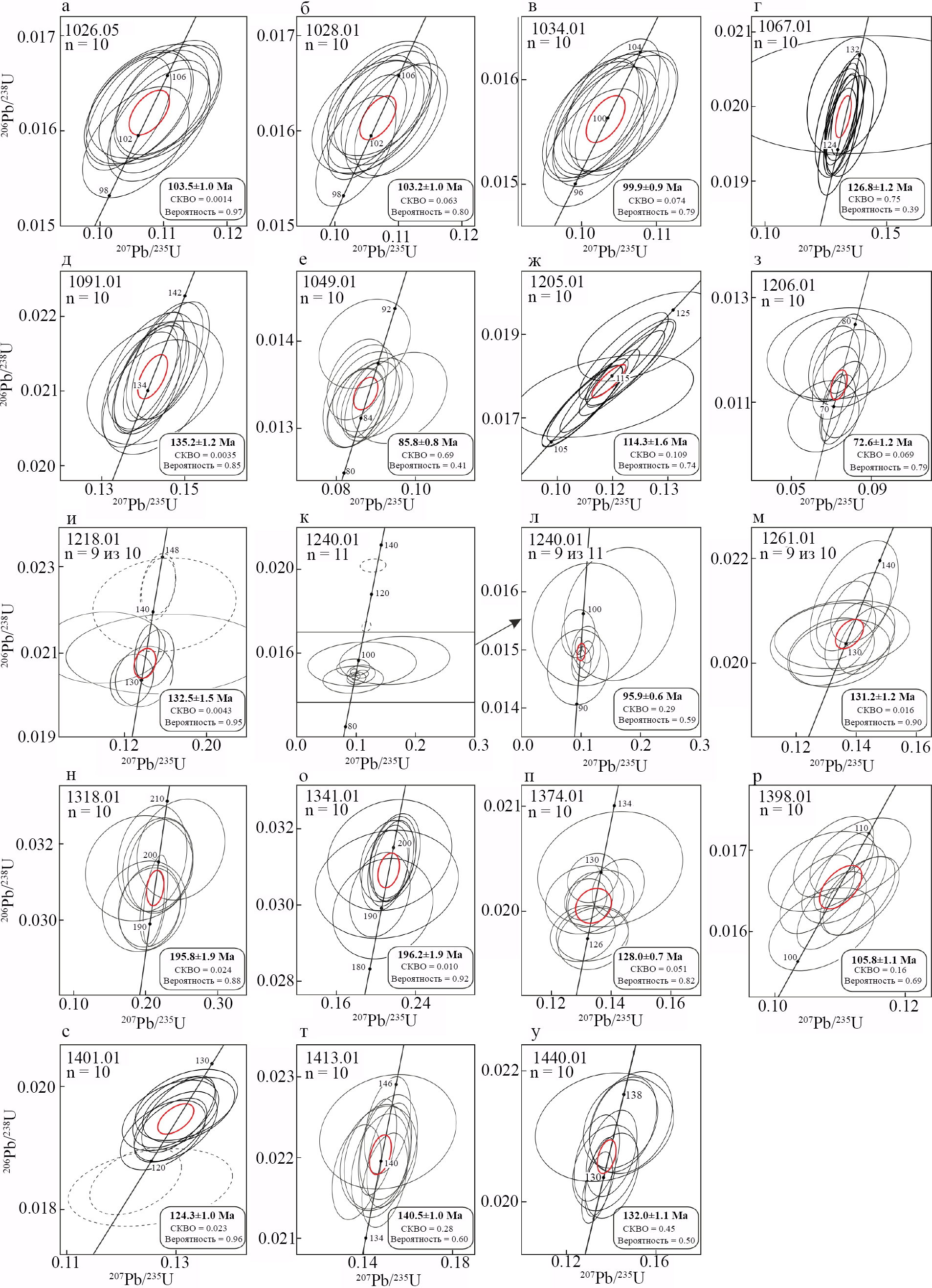 Монофракции циркона извлечены с использованием стандартной процедуры, в тяжёлых жидкостях с последующей ручной дочисткой под бинокуляром. Изотопные отношения измерялись на ионном микрозонде SHRIMP II в ЦИИ ВСЕГЕИ по методике, описанной в [15]. Почти во всех образцах проанализированы по 10 зёрен циркона, в одном образце – 11 зёрен. Для подавляющего большинства точечных анализов получены конкордантные значения изотопных отношений, и результаты для разных зёрен из одного образца хорошо сходятся между собой (см. рис. 2). Доля нерадиогенного 206Pb обычно составляет не более 0.5%, и лишь для 6 точечных анализов из 181 превышает 2%. С большой вероятностью, все полученные значения U–Pb-возраста соответствуют возрасту кристаллизации магм. В двух пробах (1218.01 – диорит из небольшого штока между Телекайским и Чануанским массивами и 1240.01 – риолитовый игнимбрит амгеньской свиты, нижнего стратона ОЧВП на этом участке) присутствуют ксенокристы циркона с относительно древним возрастом (4 и 2 зерна соответственно). Для одного из ксенокристов определён раннепротерозойский U–Pb-возраст (1864±20 млн лет), а остальные древнее главной популяции цирконов на 8–30 млн лет (см. рис. 2 и, к), что заметно превышает погрешность единичных определений. В обр. 1401.01 (субщелочной гранит главной фазы Чануанского массива) для 8 зёрен из 10 получен возраст в интервале 126–122 млн лет, а для 2 зёрен – в интервале 118–117 млн лет (рис. 2 с). Есть основания предполагать частичную потерю радиогенного свинца некоторыми цирконами обр. 1401.01, поскольку рядом с точкой отбора пробы расположен более молодой интрузив (см. рис. 1). Анализы предполагаемых ксенокристов и зёрен с нарушенной изотопной системой были исключены из расчёта общего возраста проб.
