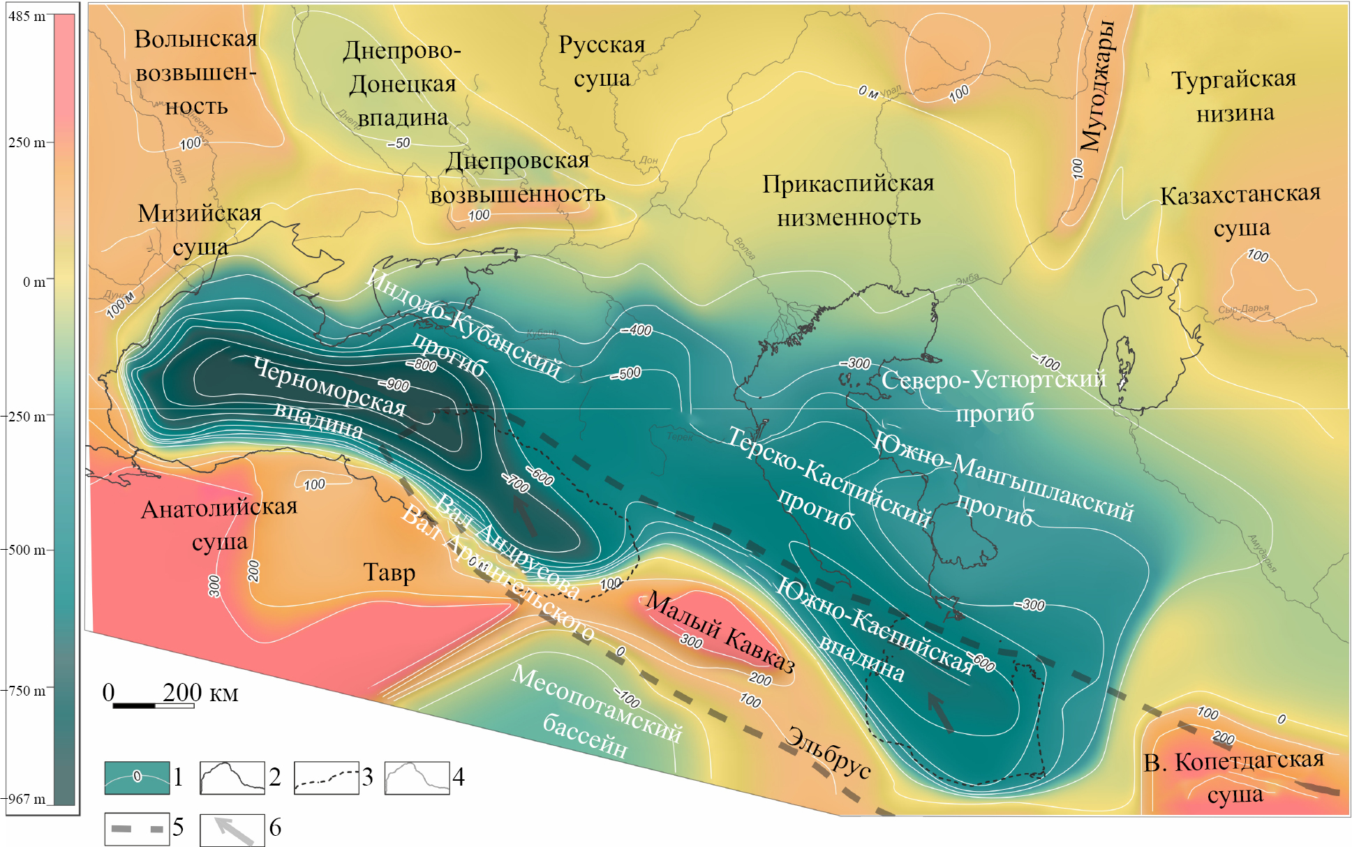 Рис. 3. Структурно-палинспастическая схема рельефа Восточного Паратетиса на соленовское время раннего олигоцена по результатам цифрового моделирования. 1 – изолинии соленовской палеоповерхности, рассчитанные от относительной отметки уровня моря в начале соленовского времени, принятой за ноль; 2 – современные береговые линии морей; 3 – береговые линии морей, перемещённые с учётом движений по зоне Крымско-Копетдагских деформаций; 4 – реки; 5 – границы Крымско-Копетдагской сдвиговой зоны деформаций; 6 – направление движения висячего крыла сдвига (в плиоцен-четвертичное время)