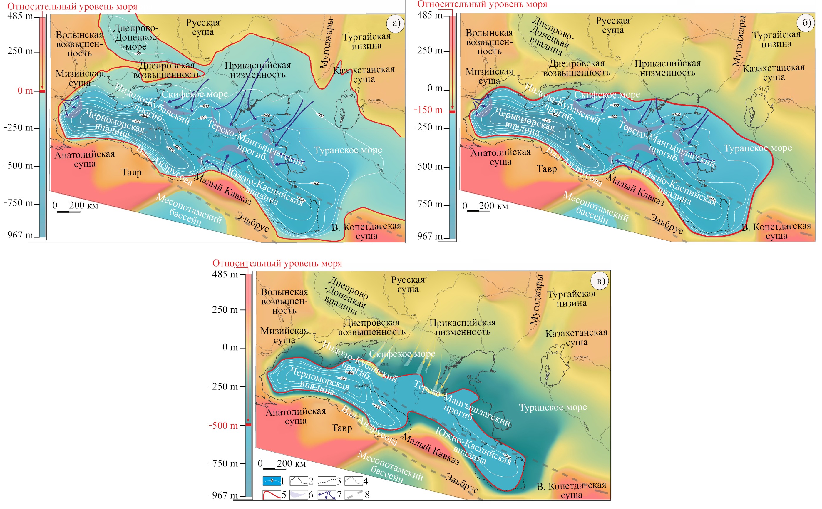 При дальнейшем падении относительного уровня моря в конце соленовского века, бассейн претерпевал более масштабные изменения (см. рис. 4 в). Практически вся территория северных шельфов осушалась, и граница береговой линии смешалась южнее на 100 и более километров. Вода сохранялась лишь в наиболее глубоко погруженных областях: кубанских и Терско-Мангышлакском прогибах, Черноморской и Каспийской впадинах. Амплитуда падения уровня моря при регрессии в позднесоленовское время оценена исходя из результатов измерения высоты абразионного уступа и глубины врезов. Она составляла около 450–500 м [21].