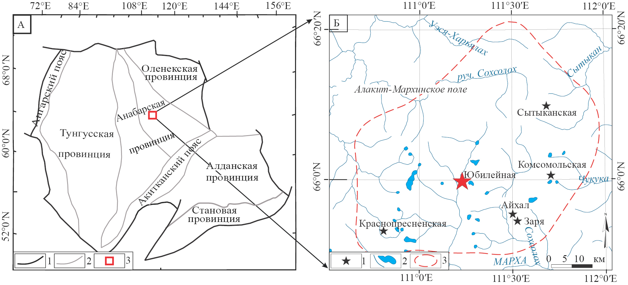Рис. 1. А – Схематическая карта Сибирского кратона [1] с изменениями; 1 – границы кратона, 2 – границы тектонических провинций, 3 – местоположение Алакит-Мархинского кимберлитового поля (АМКП) в пределах кратона. Б – Схема расположения кимберлитовых тел в АМКП [2]; 1 – коренные месторождения алмазов, 2 – реки, 3 – контур АМКП