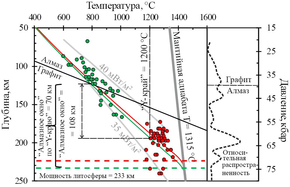 Для АМКП поля мало данных, так как мантийные ксенолиты, найденные на поверхности кимберлитовых трубок сильно изменены, однако в соседнем Далдынском поле есть трубка Удачная, в которой обнаружено много свежих неизменённых ксенолитов и для которой проведено большое количество исследований. Для трубки Удачная в работах [16–18] приведены результаты исследования мантийных ксенолитов, а также с помощью различных термобарометров рассчитаны PT-параметры этих ксенолитов. В работе [16] приведены PT-оценки хромдиопсидов из ксенолитов трубки Удачная в том числе и по мономинеральному клинопироксеновому термобарометру NT00. Мы использовали приведённые в работе [16]. PT-оценки клинопироксенов для реконструирования палеогеотермы под трубкой Удачная для того чтобы сравнить палеогеотерму, мощности литосферы и “алмазного окна” под трубками Юбилейная и Удачная. Исследованные ксенолиты трубки Удачная [16–18] представлены крупнозернистыми перидотитами (рис. 4, зелёные кружки), а также переходными и катаклазированными перидотитами (рис. 4, красные кружки). Переходные и катаклазированные перидотиты характеризуются высокими температурами равновесия (>1200 °С), что может быть связано с локальным тепловым воздействием астеносферы на глубинную часть литосферной мантии. Для реконструирования палеогеотермы использованы хромдиопсиды только из ксенолитов, где клинопироксен находится в равновесии с ортопироксеном и гранатом [16]. Были использованы такие же значения теплогенерации и мощности верхней и нижней коры как для трубки Юбилейная. Результирующий поверхностный тепловой поток для трубки Удачная составил 35.1 мВт/м2, при мощности литосферы 224 км, и мощности “алмазного окна” 99 км (см. рис. 4). По причине высоких температур равновесия мы исключили хромдиопсиды из переходных и катаклазированных перидотитов и использовали только хромдиопсиды из крупнозернистых перидотитов. В результате тепловой поток составил 34.7 мВт/м2, мощность литосферы 233 км, мощность “алмазного окна” 108 км, а мощность “алмазного окна”, определённая по “Y-краю” в гранатах согласно [9] составляет 70 км (от 125 до 195 км) (см. рис. 4).