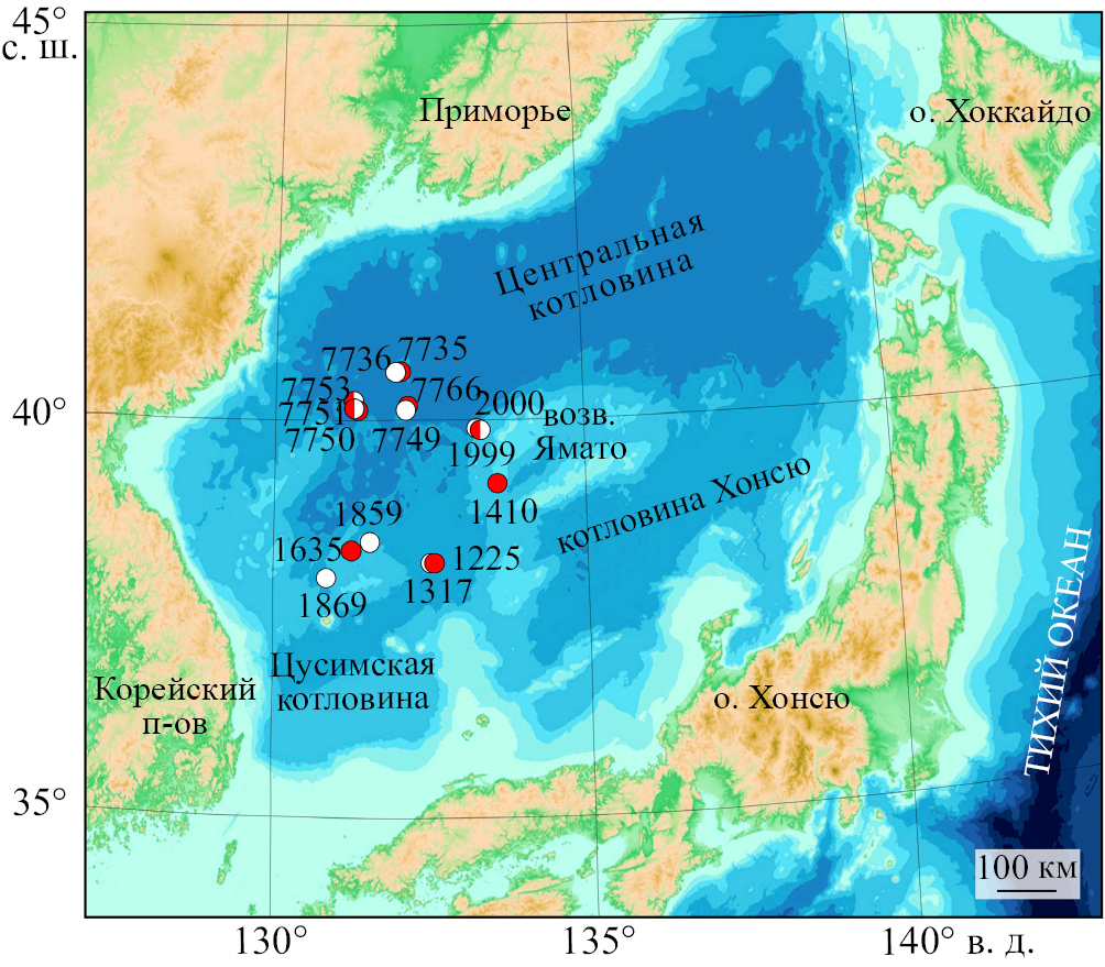 Рис. 1. Карта Японского моря с указанием наиболее крупных морфологических элементов дна и станций драгирования ЖМО (красные кружки) и вулканических пород (белые кружки). Станции 1635, 1859, 1869 – возвышенность Криштофовича. Станции 1410, 1999, 2000 – хребет Северное Ямато. Станции 1225, 1317 – возвышенность Галагана. Станции 7735, 7736 – возвышенность Гэбасс. Станции 7750, 7751, 7753 – возвышенность Евланова. Станции 7749, 7766 – гора Кольцо. Картографическая основа составлена по данным ГЕБКО 2022