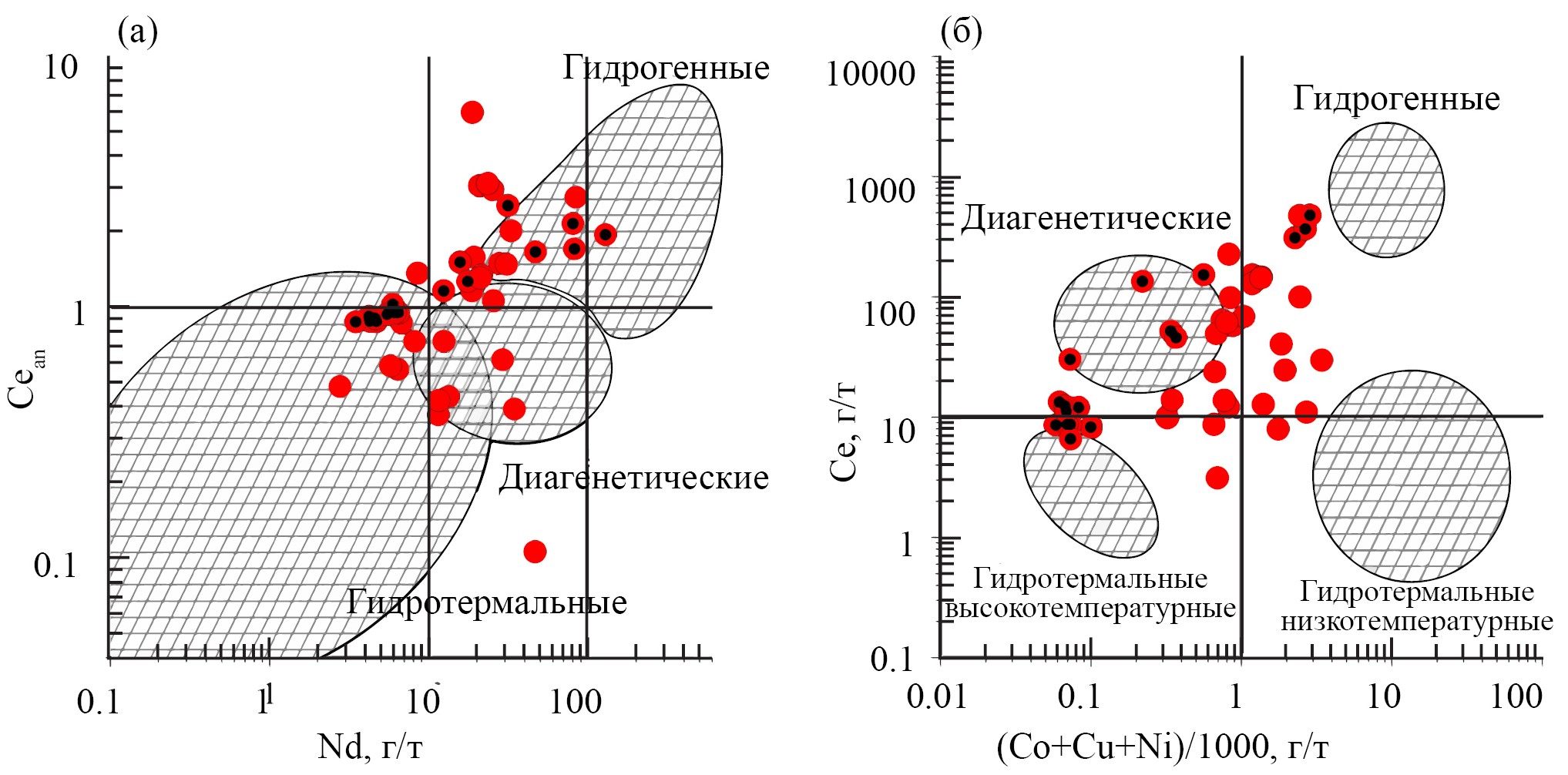Рис. 3. Положение ЖМО Японского моря (красные кружки) на генетических диаграммах [18] (а) и [19] (б). Чёрными точками отмечены пробы с содержанием германия ≥ 15 г/т. Полный химический состав ЖМО приведён в приложении (см. электронное приложение, табл. 2S)