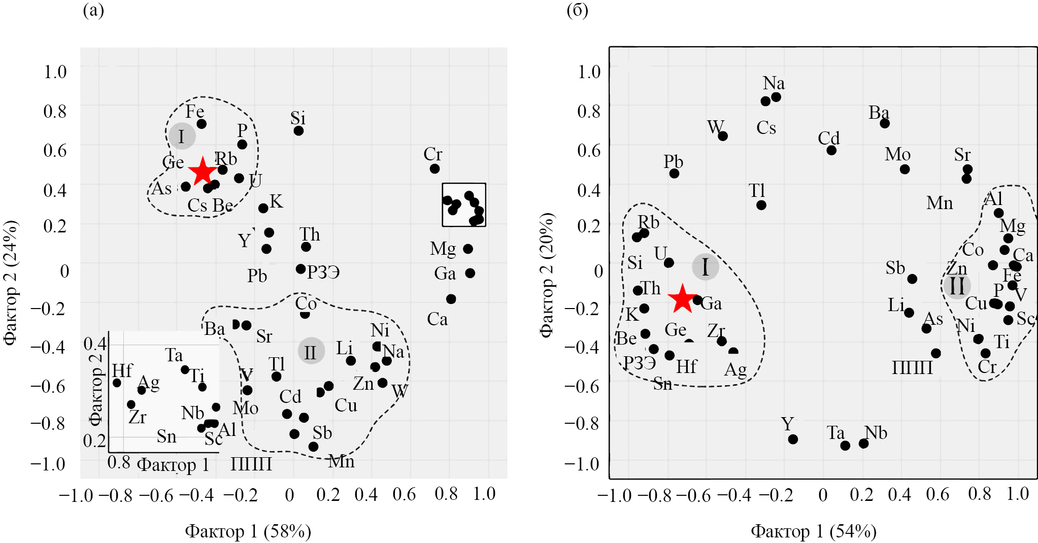 Рис. 4. Графики факторных нагрузок для германия, других химических элементов и потерь при прокаливании (ППП) в ЖМО (а) и вулканических породах (б) Японского моря. Основные группы элементов выделены пунктирной линией, их номера – римскими цифрами. Положение германия отмечено звёздочкой. Полный химический состав и корреляционные матрицы для ЖМО и вулканических пород приведены в приложении (см. электронное приложение, табл. 3S)