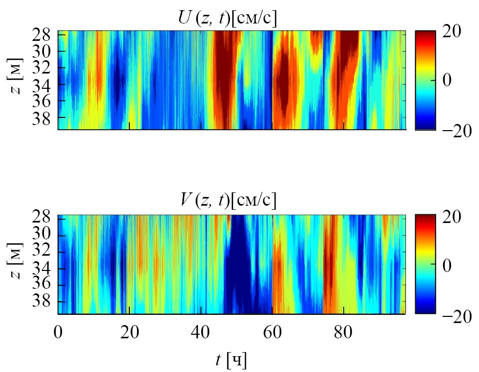 Результаты измерений скорости течения в нижнем слое моря на станции INF показаны на рис. 2 (зональная (U) и меридиональная (V) компоненты). Видно, что скорость течения весьма значительна (в отдельные моменты времени превышает 0.4 м/с), имеет ярко выраженную вертикальную структуру, также характерна сильная изменчивость во времени, как по величине, так и по направлению. Фрагмент записи в период от 40 до 90 часов от начала записи характеризуется заметной квазипериодичностью с преобладанием длинноволновых компонент с периодом близким к инерционному периоду для широты места наблюдений (16–18 ч). В поле температуры и плотности в этот же период были выявлены три ярко выраженных внутренних волновых фронта с теми же спектральными свойствами.