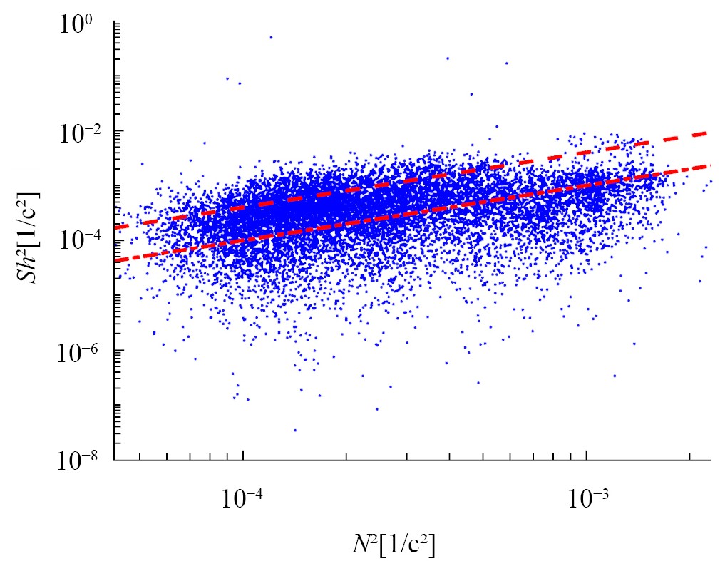 На рис. 5 показана диаграмма рассеяния N2 – Sh2, рассчитанная по данным наблюдений на станциях S06 и INF. Учёт двух критических значений показывает, что в слое измерения течений за время наблюдений генерация турбулентной кинетической энергии возможна примерно в 15% случаев, а её сохранение – в 44% случаев.