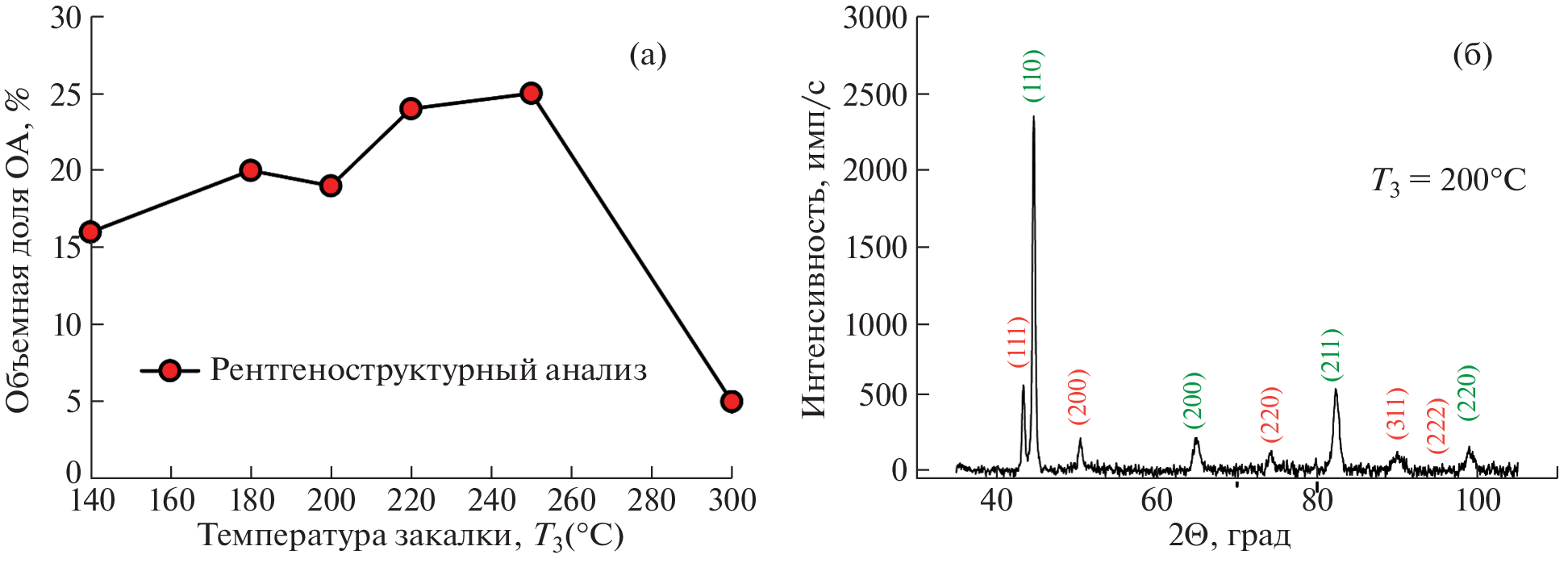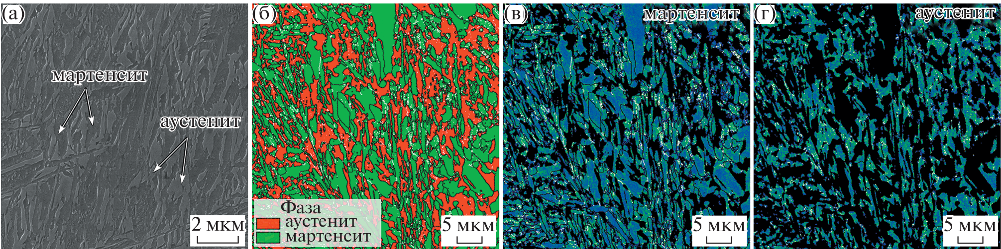 Сталь типа 44ХГ2С2М после обработки закалка–распределение (Q&P) имеет высокий показатель произведения прочности на удлинение σB · δ >30 ГПa · % и предел текучести σ0.2 >1000 МПа, что соответствует требованиям для перспективных высокопрочных сталей третьего поколения. Уникальное сочетание прочности и пластичности связано с высокой объемной долей остаточного аустенита >25%, прочность которого обусловлена высоким содержанием углерода (~1.3%) и высокой плотностью решеточных дислокаций (~6 × 1014 м–2). Высокая пластичность стали обеспечивается трансформацией остаточного аустенита в мартенсит при растяжении, что приводит к упрочнению стали при пластической деформации и способствует достижению больших величин предела прочности σB и относительного удлинения δ.