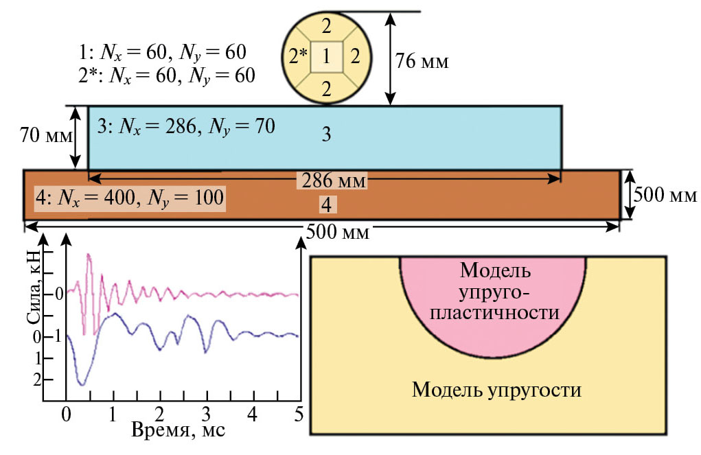 Для численных расчетов в двумерном случае расчетная область разбивалась на сегменты согласно рис. 1: 1, 2 соответствуют шару, 3 – льду, 4 – плите. В каждом сегменте строилась структурированная сетка, число ячеек вдоль горизонтальной Nx и вертикальной Ny осей указаны на рисунке, шаг по времени равнялся 5 ∙ 10–8 c. Сетки под номерами 2 формировались вращением сетки 2*. Между областями 1–2 ставилось контактное условие полного слипания, между 2–3 и 3–4 – условие проскальзывания в области контакта. На боковых и нижней границах подставки использовалось условие поглощения, на поверхности шара, льда, выступающей верхней поверхности подставки была установлена свободная граница. В качестве начального условия в сетках шара задавалась скорость соударения 0.56 м/с, сетки сдвигались с помощью коррекции по Лагранжу. Узлы сеток шара и льда, находящиеся на расстоянии 0.05 мм друг от друга, считались контактирующими. Изначальное расстояние между ними также равнялось 0.05 мм.