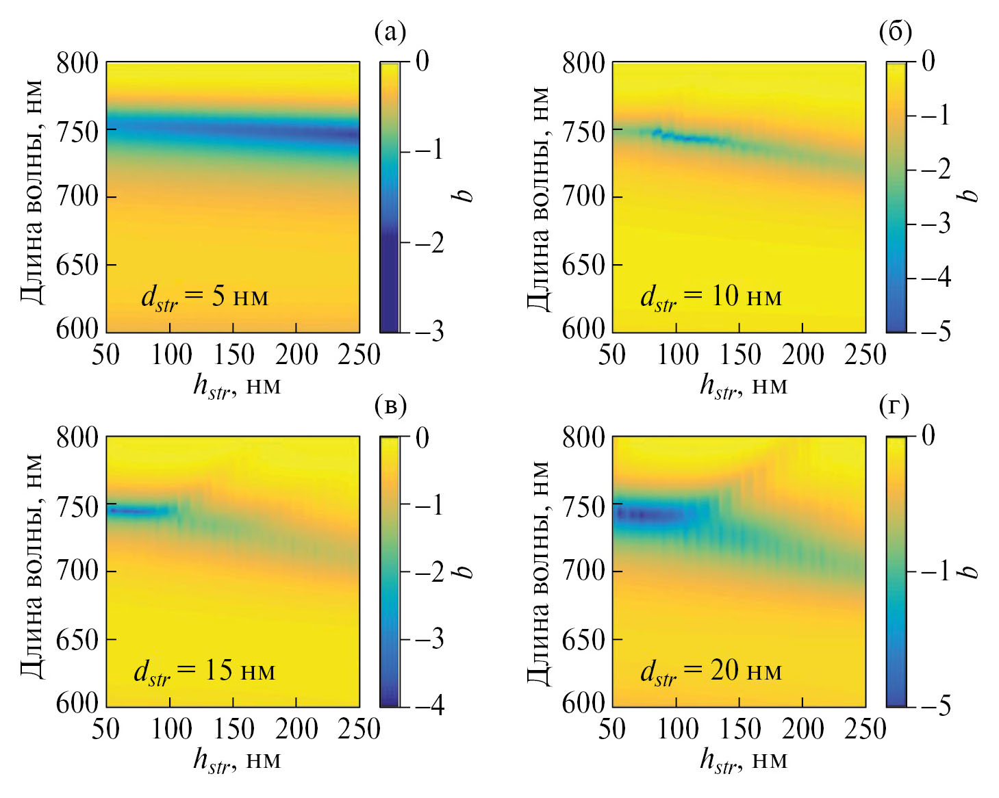 Слой перовскита CH3NH3PbI3 (MAPbI3) толщиной 200 нм размещен между слоями с электронной (SnO2) и дырочной (Spiro-OMeTAD) проводимостью толщинами 20 нм. Ширина hstr и толщина dstr нанополосы в золотой решетке варьировалась при постоянном значении периода p = 300 нм. Элементарная ячейка ФК сформирована из диоксида кремния SiO2 и диоксида титана TiO2 с показателями преломления nSiO2 = 1.45, nTiO2 = 2.5 и толщинами dSiO2 = 120 нм, dTiO2 = 80 нм соответственно. Количество слоев ФК N = 10.