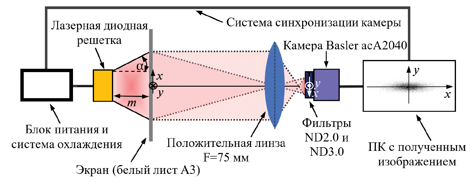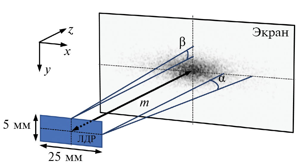 Для верификации методики определения угловых параметров источника проведен физический эксперимент по измерению пространственного распределения интенсивности пятна излучения ЛДР, в результате которого экспериментально определялись углы расходимости лазерной диодной решетки производства НПП “Инжект”, используемой в составе разрабатываемых модулей накачки в Федеральном исследовательском центре “Институт общей физики им. А.М. Прохорова РАН” (ФИЦ ИОФ РАН). Данный источник излучения имеет следующие основные параметры: центральная длина волны излучения 806 ± 3 нм, излучающая область 25 × 5 мм, напряжение на излучателе 110 В при рабочей амплитуде импульса тока накачки 45 А, средняя оптическая мощность излучения 2 кВт с длительностью импульса 250 мкс и частотой повторения 2 Гц. По указанным в паспорте данного источника значениям углов расходимости θfwhm ≤ 45°, 15° и по формуле (2) вычислены предельные паспортные значения углов расходимости излучения αn, βn ≤ 38.2°, 12.7°. Оптическая схема эксперимента представлена на рис. 3.