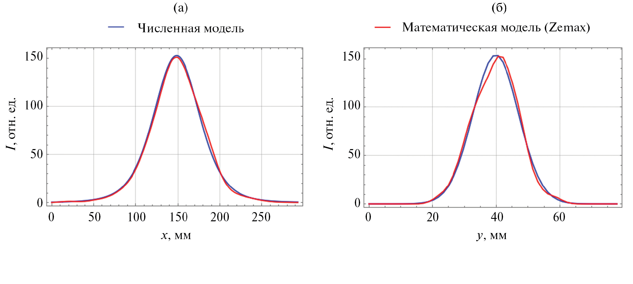Рис. 2. Пространственные распределения интенсивности пятна излучения массива диодов, полученные в численном эксперименте (Zemax) (красный график) и рассчитанные с помощью модельной функции и метода наименьших квадратов (синий график); а – серединное горизонтальное сечение; б – серединное вертикальное сечение.