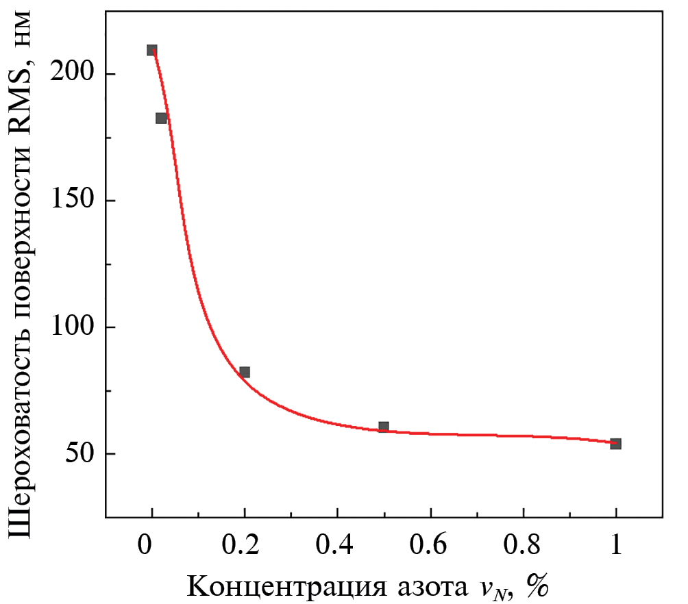 Измеренные значения шероховатости поверхности выращенных пленок представлены на рис. 3. Постепенное увеличение концентрации азота приводит к резкому (более чем в 2 раза) снижению шероховатости поверхности при [N2] ≈ 0.2%. Дальнейшее увеличение концентрации азота не приводит к существенному снижению шероховатости поверхности.