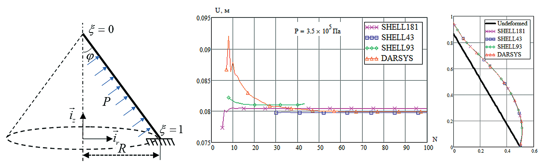 Рассмотрим задачу о деформировании конической оболочки под действием внутреннего распределенного давления P, радиус окружности дна R = 0.5 м, угол конуса φ = π / 6 (рис. 8), толщину и параметры материала взяты из предыдущих примеров. На рис. 8 приведена деформированная конфигурация и зависимости полного перемещения вершины конуса (ξ = 0) от числа разбиений, рассчитанные в ANSYS и по формулам (12)–(16) при значении давления P = 3.5 ∙ 105 Па.