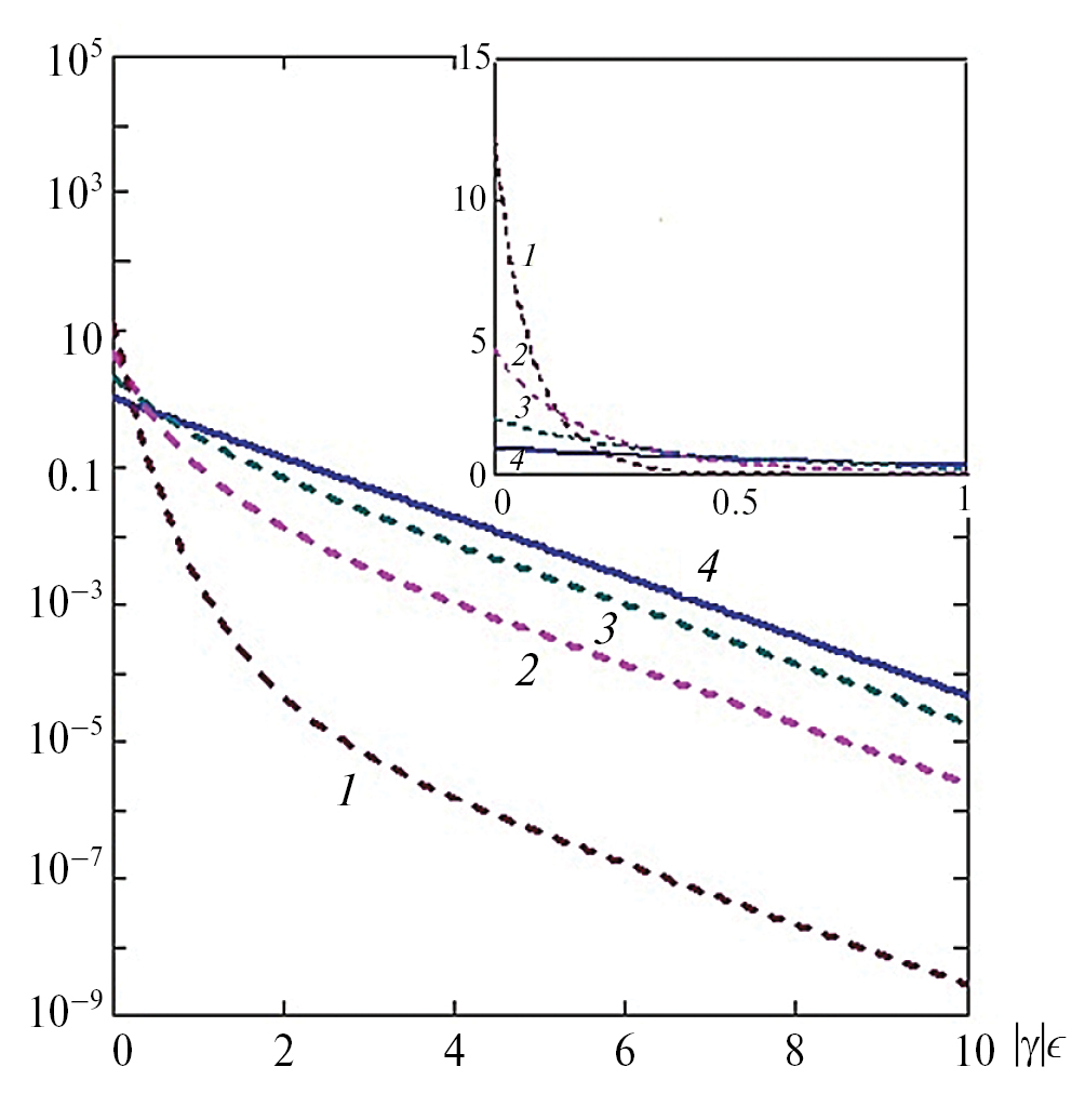 Рис. 1. Нормированные на 1 функции распределения pimi (штриховые кривые 1, 2 и 3) при различных параметрах нормировки α: α = 2.5 (1), α = 1.5 (2), α = 0.5 (3), а также pi = |γ|eγϵi (4). Принято |γ| = 1. Полулогарифмический масштаб. На врезке – то же в равномерных координатах.